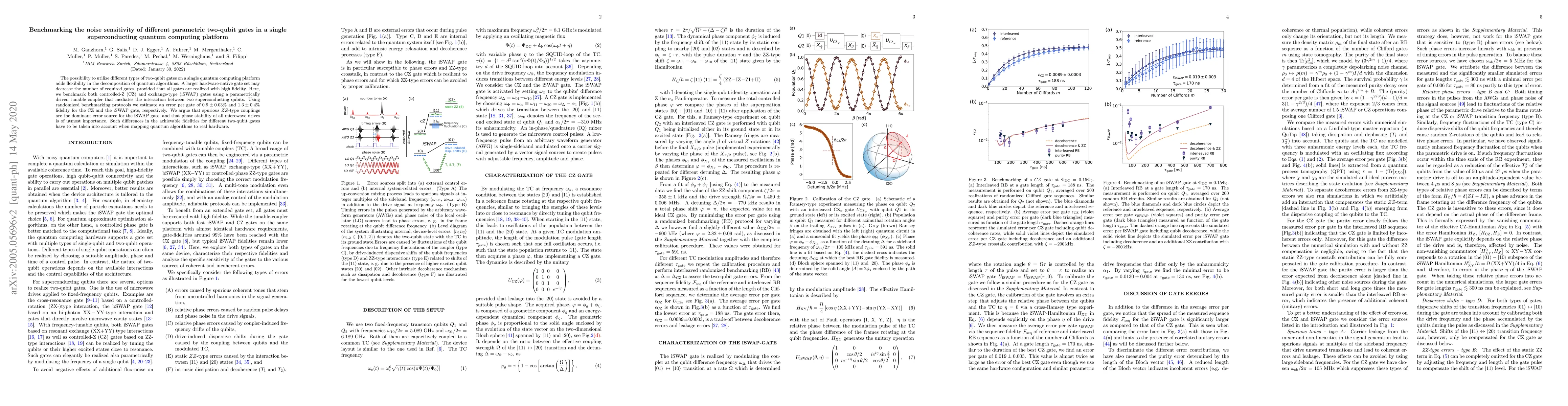 This paper benchmarks the noise sensitivity of controlled-Z and iSWAP gates in a superconducting quantum computing platform, finding error rates of $0.9\pm0.03\%$ and $1.3\pm0.4\%$ respectively. It highlights the importance of phase stability in microwave drives and identifies spurious $ZZ$-type couplings as the main error source for iSWAP gates.