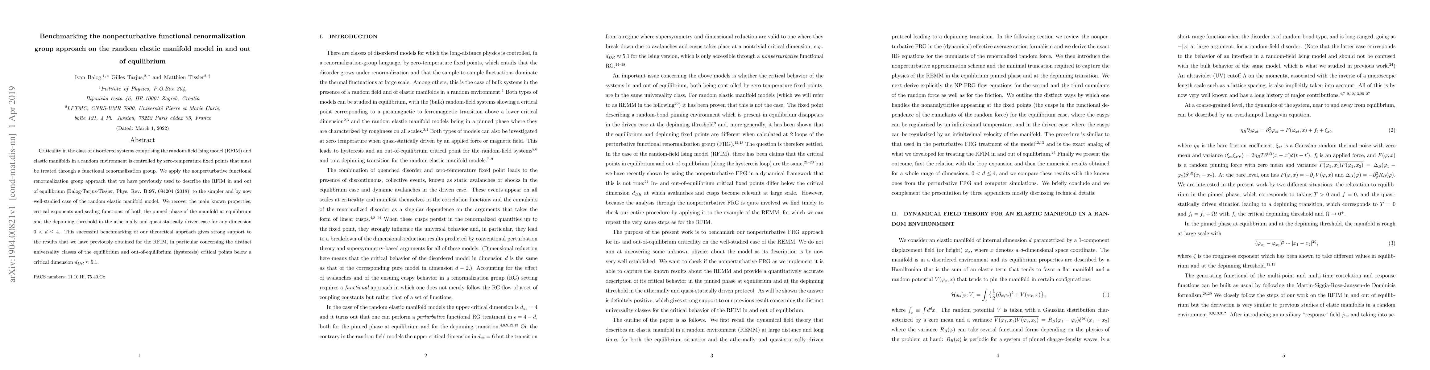 This paper benchmarks the nonperturbative functional renormalization group approach on the random elastic manifold model, recovering known critical exponents and scaling functions for both equilibrium and driven cases. The successful application supports previous findings on the random-field Ising model, particularly regarding distinct universality classes for equilibrium and out-of-equilibrium critical points.