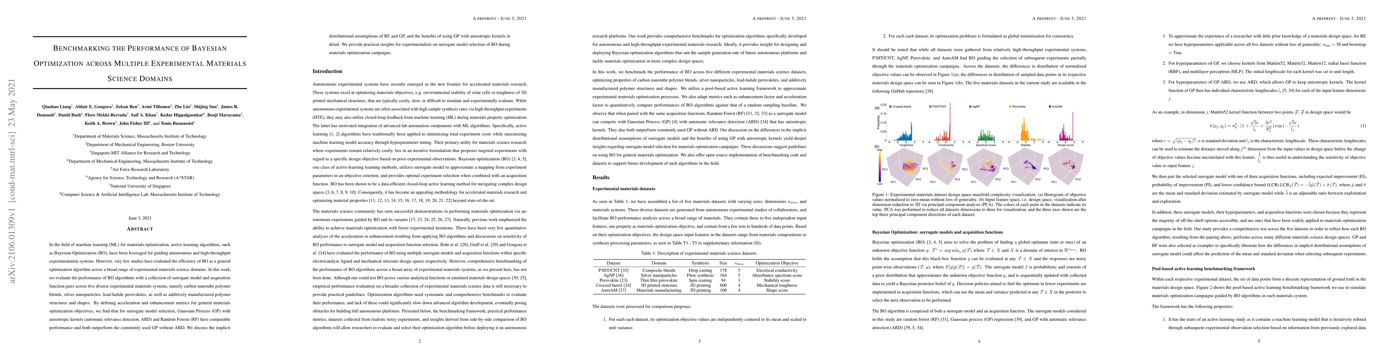 This study benchmarks the performance of Bayesian Optimization across five diverse materials science domains, finding that Gaussian Processes with anisotropic kernels and Random Forests both outperform standard Gaussian Processes in surrogate model selection. Practical insights are provided for optimizing materials experiments using Bayesian Optimization.