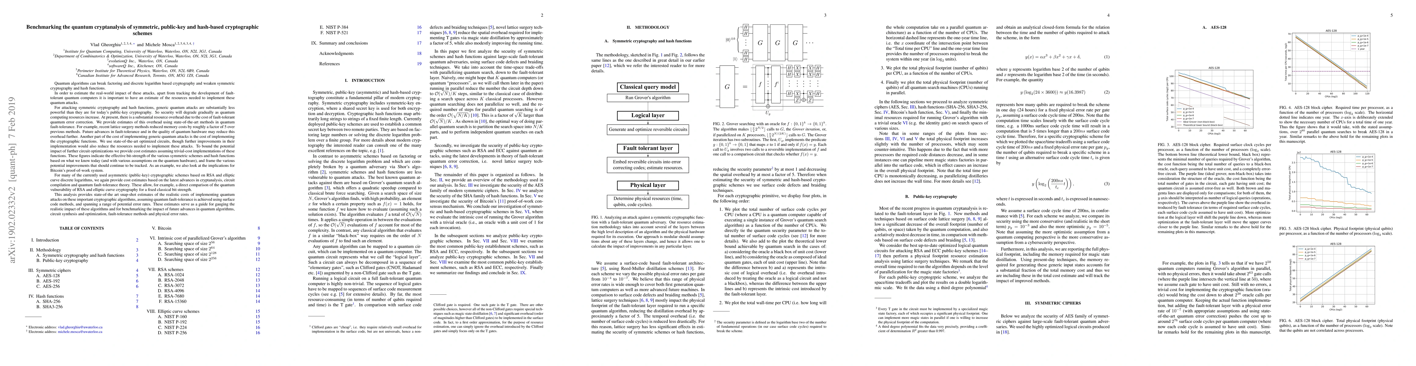 This paper benchmarks the quantum cryptanalysis of symmetric, public-key, and hash-based cryptographic schemes, estimating the resources required for quantum attacks. It highlights that while quantum computing poses a threat to public-key cryptography, symmetric and hash functions will degrade more gradually, with significant resource overhead due to fault-tolerant quantum error correction.