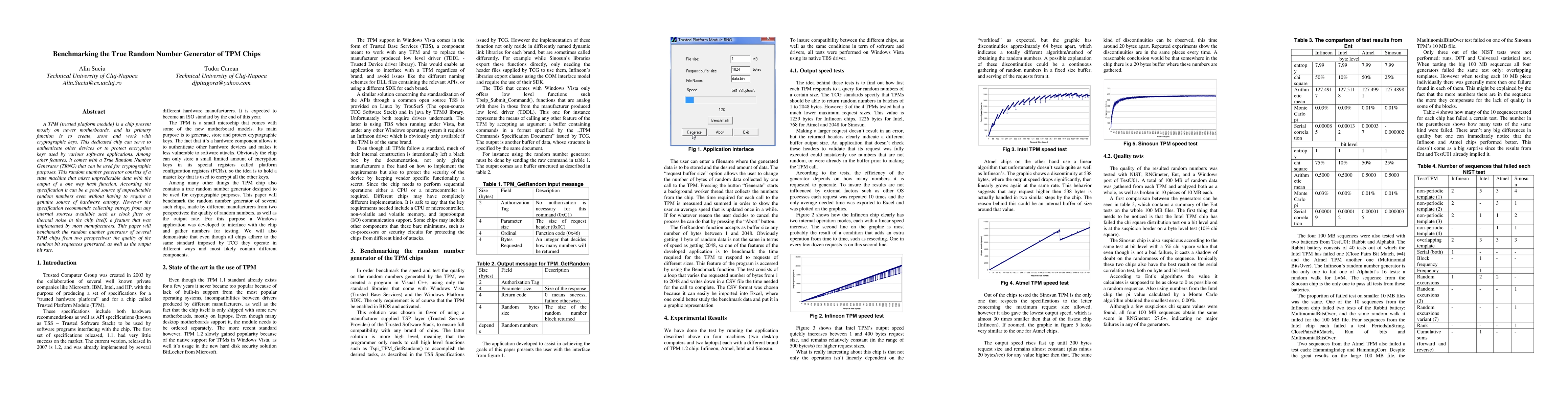 A TPM (trusted platform module) is a chip present mostly on newer motherboards, and its primary function is to create, store and work with cryptographic keys. This dedicated chip can serve to authenticate other devices or to protect encryption keys used by various software applications. Among other features, it comes with a True Random Number Generator (TRNG) that can be used for cryptographic purposes. This random number generator consists of a state machine that mixes unpredictable data with the output of a one way hash function. According the specification it can be a good source of unpredictable random numbers even without having to require a genuine source of hardware entropy. However the specification recommends collecting entropy from any internal sources available such as clock jitter or thermal noise in the chip itself, a feature that was implemented by most manufacturers. This paper will benchmark the random number generator of several TPM chips from two perspectives: the quality of the random bit sequences generated, as well as the output bit rate.