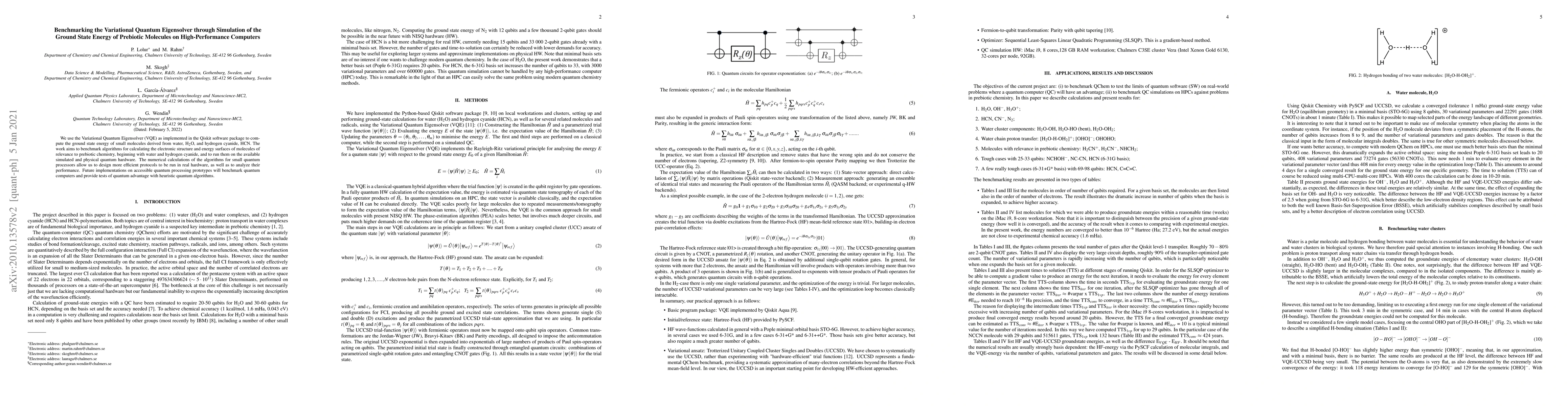 We use the Variational Quantum Eigensolver (VQE) as implemented in the Qiskit software package to compute the ground state energy of small molecules derived from water, H$_2$O, and hydrogen cyanide, HCN. The work aims to benchmark algorithms for calculating the electronic structure and energy surfaces of molecules of relevance to prebiotic chemistry, beginning with water and hydrogen cyanide, and to run them on the available simulated and physical quantum hardware. The numerical calculations of the algorithms for small quantum processors allow us to design more efficient protocols to be run in real hardware, as well as to analyze their performance. Future implementations on accessible quantum processing prototypes will benchmark quantum computers and provide tests of quantum advantage with heuristic quantum algorithms.