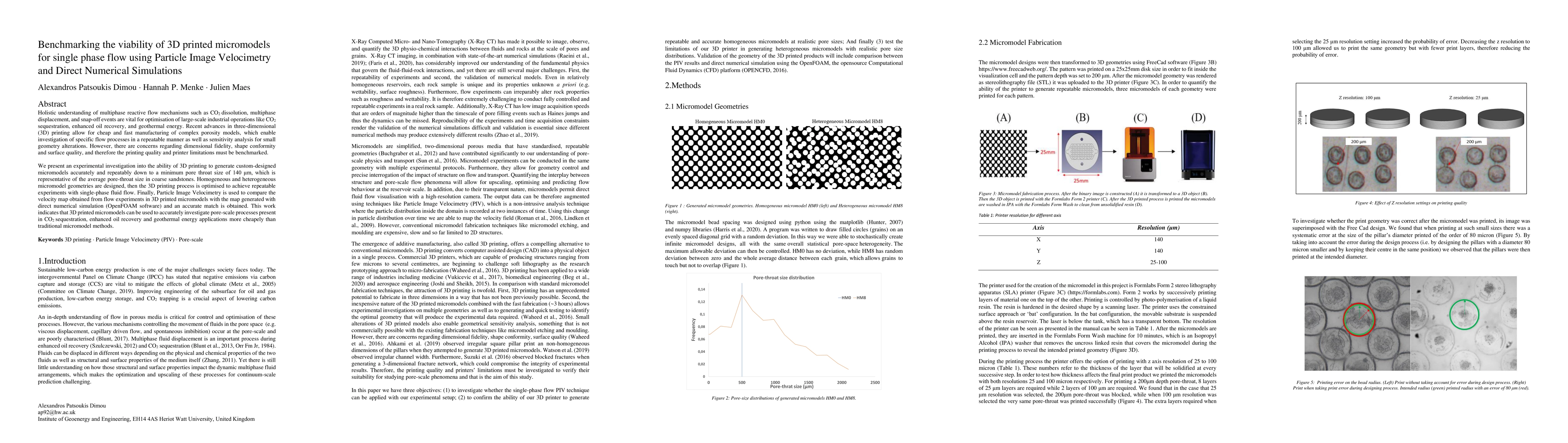 Holistic understanding of multiphase reactive flow mechanisms such as CO$_2$ dissolution, multiphase displacement, and snap-off events are vital for optimisation of large-scale industrial operations like CO$_2$ sequestration, enhanced oil recovery, and geothermal energy. Recent advances in three-dimensional (3D) printing allow for cheap and fast manufacturing of complex porosity models, which enable investigation of specific flow processes in a repeatable manner as well as sensitivity analysis for small geometry alterations. However, there are concerns regarding dimensional fidelity, shape conformity and surface quality, and therefore the printing quality and printer limitations must be benchmarked. We present an experimental investigation into the ability of 3D printing to generate custom-designed micromodels accurately and repeatably down to a minimum pore throat size of 140 micrometers, which is representative of the average pore-throat size in coarse sandstones. Homogeneous and heterogeneous micromodel geometries are designed, then the 3D printing process is optimised to achieve repeatable experiments with single-phase fluid flow. Finally, Particle Image Velocimetry is used to compare the velocity map obtained from flow experiments in 3D printed micromodels with the map generated with direct numerical simulation (OpenFOAM software) and an accurate match is obtained. This work indicates that 3D printed micromodels can be used to accurately investigate pore-scale processes present in CO$_2$ sequestration, enhanced oil recovery and geothermal energy applications more cheapely than traditional micromodel methods.
