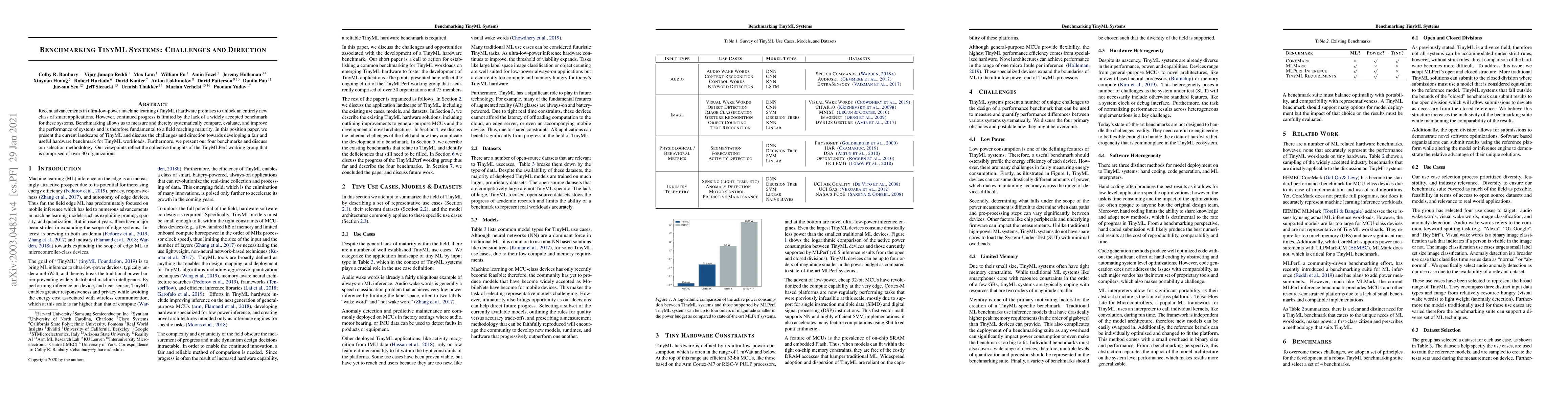 This paper discusses the need for a standardized benchmark to evaluate TinyML systems, highlighting the current challenges and proposing a direction for developing such benchmarks. The authors present four proposed benchmarks and their selection methodology, reflecting the collective insights of the TinyMLPerf working group.