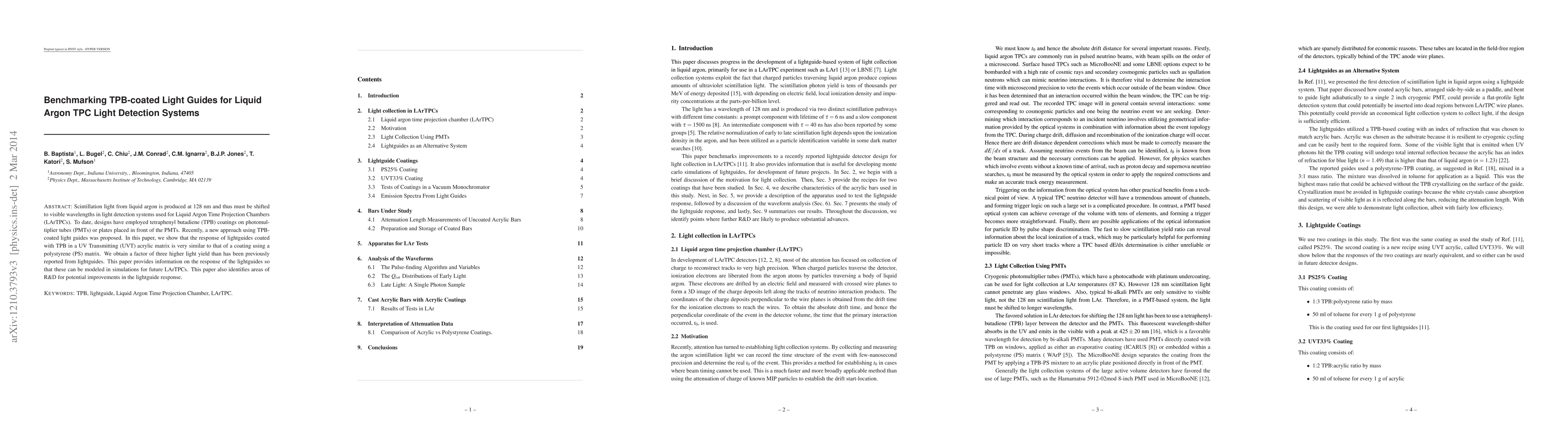 This paper benchmarks TPB-coated light guides for liquid argon TPC light detection systems, demonstrating comparable performance to traditional coatings while achieving a threefold higher light yield. It provides data for simulation modeling and identifies R&D opportunities for further enhancements.