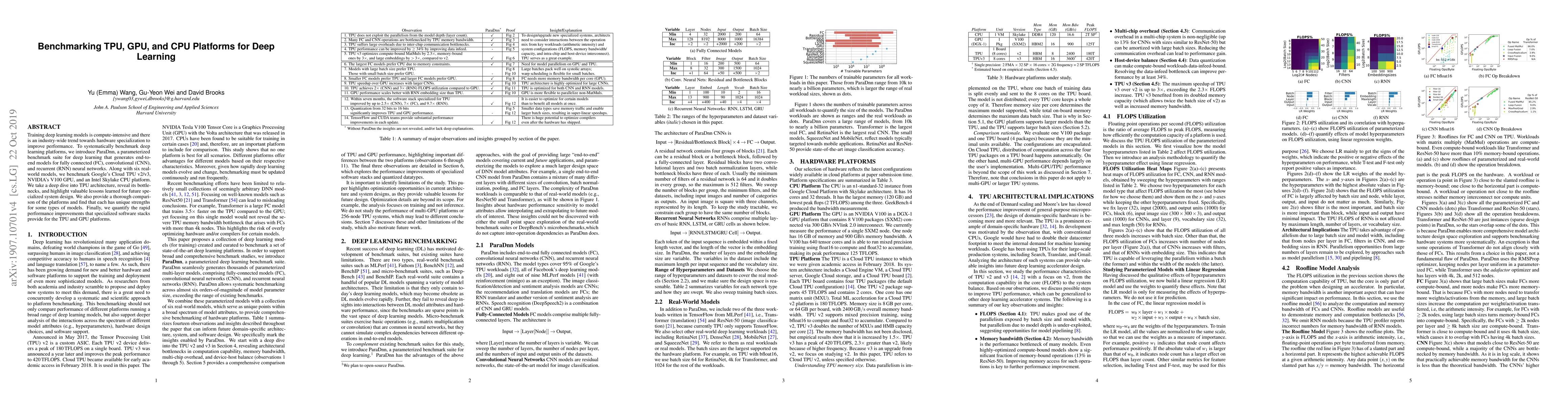 This paper benchmarks Google's TPU v2/v3, NVIDIA's V100 GPU, and Intel Skylake CPU for deep learning using ParaDnn, revealing each platform's unique strengths and bottlenecks, especially highlighting TPU's performance improvements with specialized software.