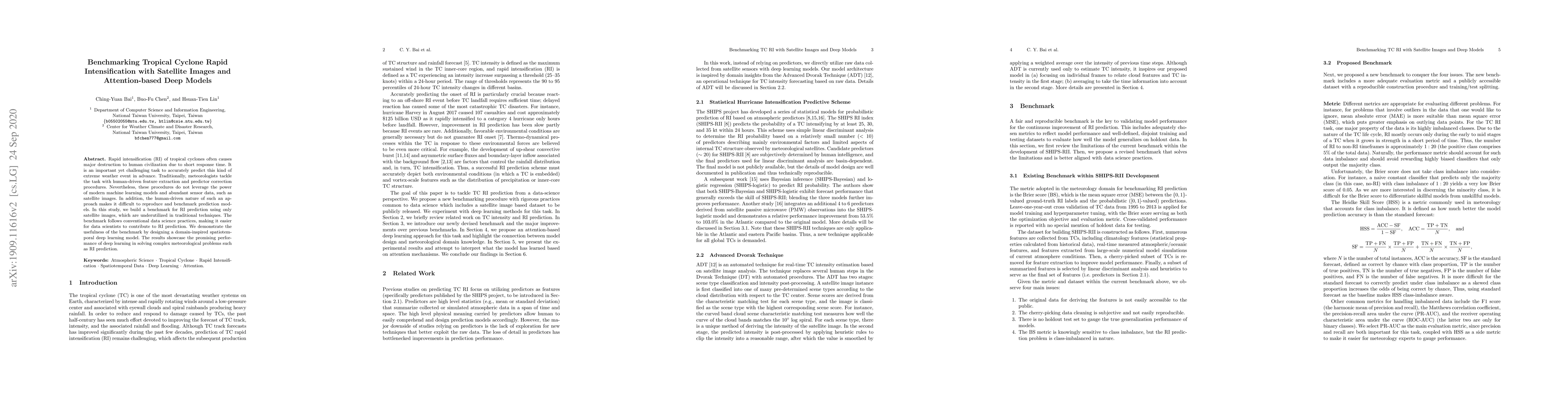 This paper establishes a benchmark for predicting rapid intensification of tropical cyclones using satellite images and an attention-based deep learning model, showcasing the potential of modern machine learning over traditional methods. The study highlights the effectiveness of leveraging satellite data and deep learning for more accurate and reproducible extreme weather predictions.