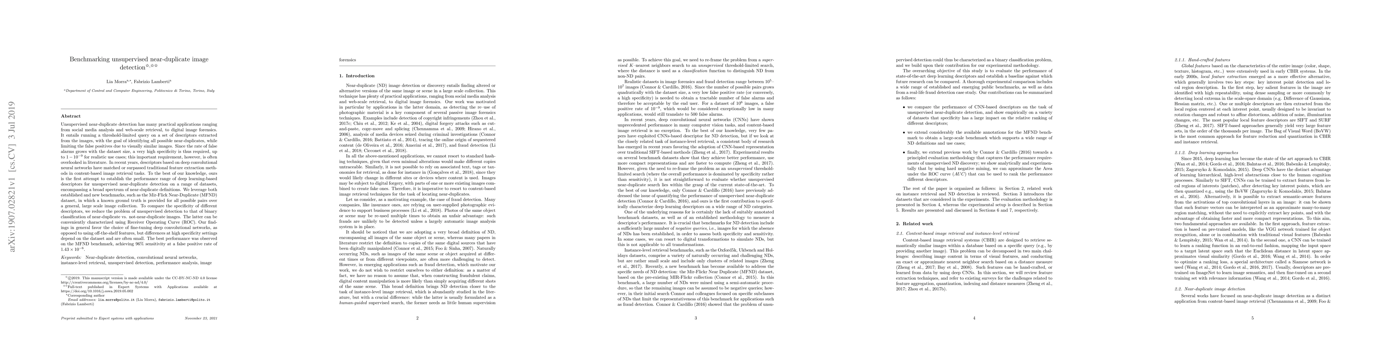 A study benchmarks deep learning-based descriptors for unsupervised near-duplicate image detection, achieving 96% sensitivity at a low false positive rate of $1.43 imes 10^{-6}$ on the Mir-Flick Near-Duplicate dataset.