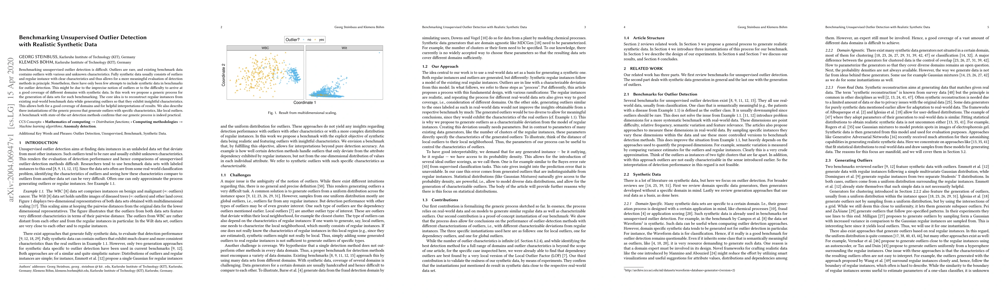 This paper proposes a method for generating synthetic data sets for benchmarking unsupervised outlier detection, aiming to cover various domains and provide meaningful insights. The authors introduce a generic process to reconstruct regular instances and generate outliers with specific characteristics, validated through a benchmark with state-of-the-art detection methods.