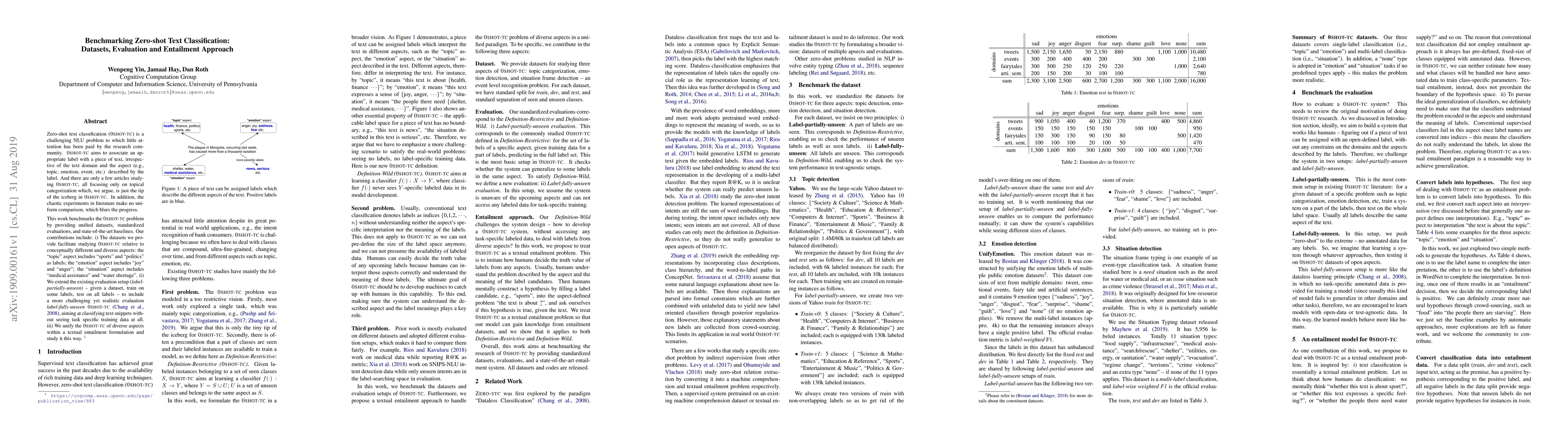 This research paper benchmarks zero-shot text classification by providing unified datasets, standardized evaluations, and state-of-the-art baselines for various aspects of text classification, including topic, emotion, and situation.