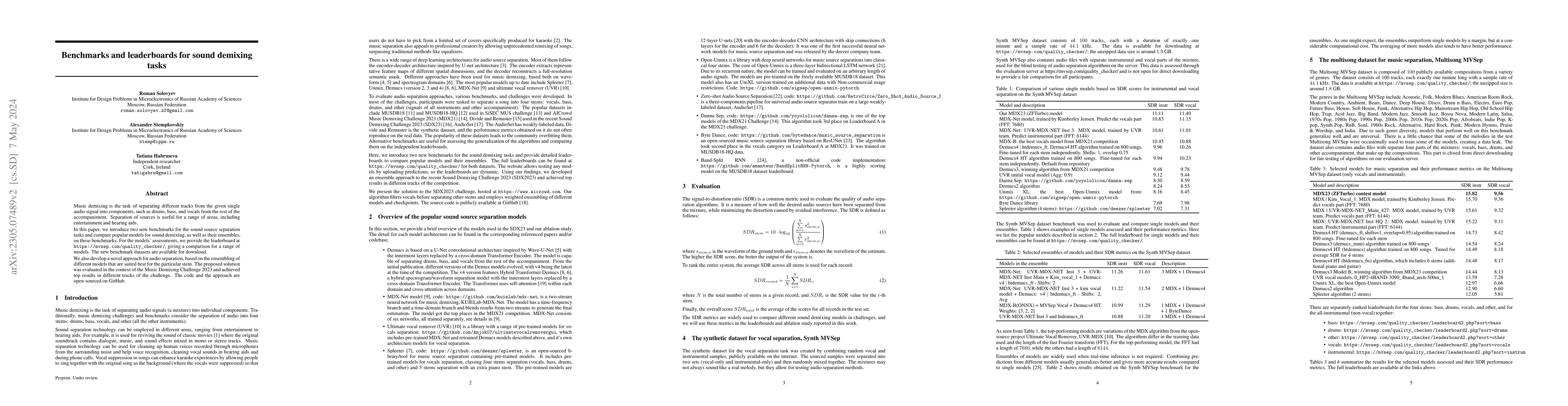 This paper introduces two new benchmarks for evaluating sound source separation, focusing on music demixing. It compares various models and their ensembles on these benchmarks, providing a leaderboard for easy comparison and releasing new datasets. A novel ensemble approach for audio separation achieved top results in the Music Demixing Challenge 2023, and both the datasets and code are open-sourced.