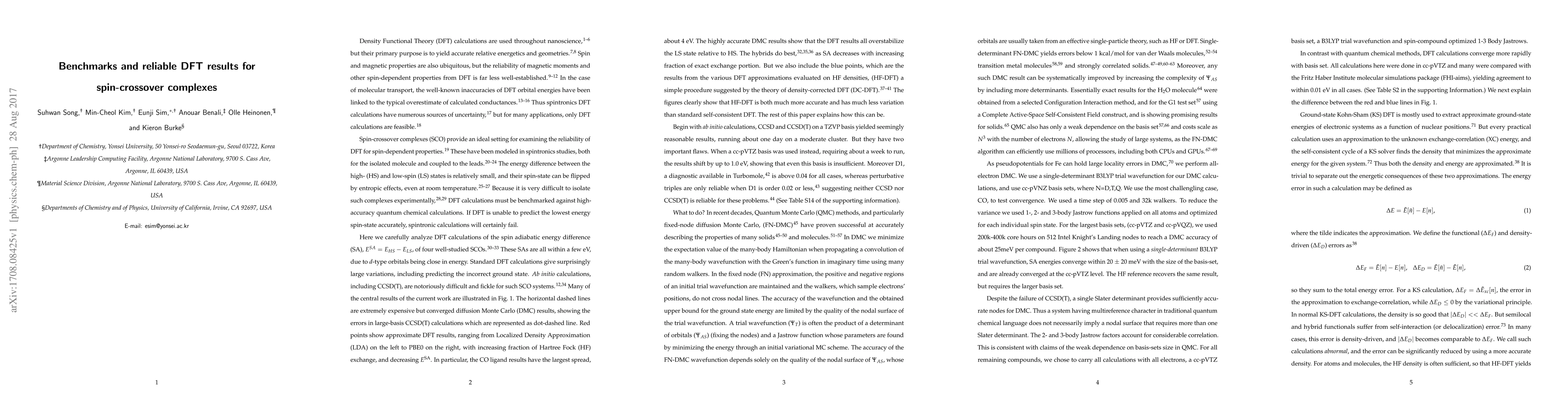 DFT is used throughout nanoscience, especially when modeling spin-dependent properties that are important in spintronics. But standard quantum chemical methods (both CCSD(T) and self-consistent semilocal density functional calculations) fail badly for the spin adiabatic energy difference in Fe(II) spin-crossover complexes. We show that all-electron fixed-node diffusion Monte Carlo can be converged at significant computational cost, and that the B3LYP single-determinant has sufficiently accurate nodes, providing benchmarks for these systems. We also find that density-corrected DFT, using Hartree-Fock densities (HF-DFT), greatly improves accuracy and reduces dependence on approximations for these calculations. The small gap in the self-consistent DFT calculations for the high-spin state is consistent with this. For the spin adiabatic energy differences in these complexes, HF-DFT is both accurate and reliable, and we make a strong prediction for the Fe-Porphyrin complex. The "parameter-dilemma" of needing different amounts of mixing for different properties is eliminated by HF-DFT.