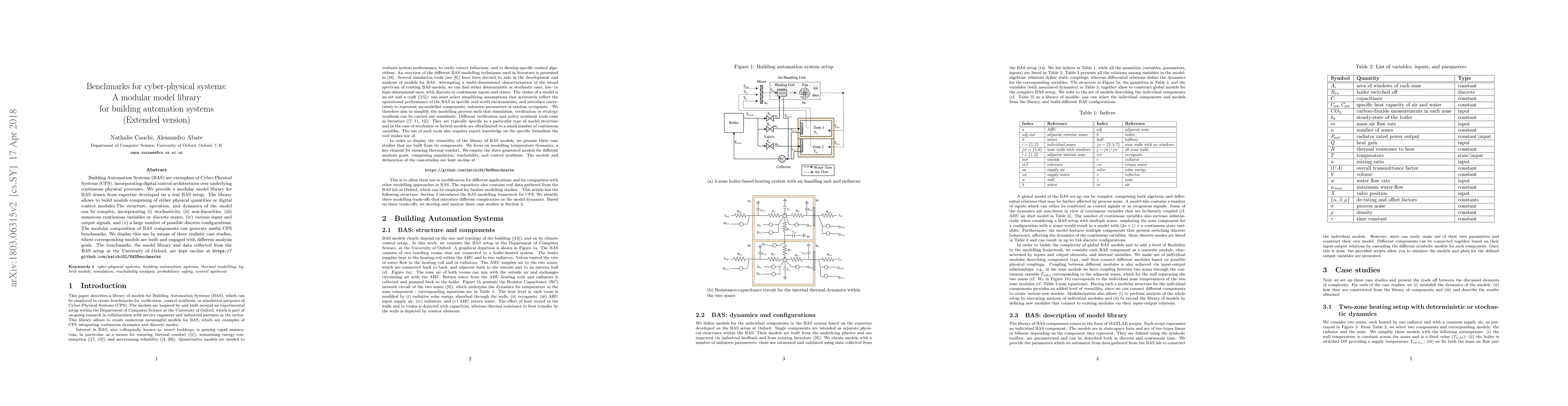 Building Automation Systems (BAS) are exemplars of Cyber-Physical Systems (CPS), incorporating digital control architectures over underlying continuous physical processes. We provide a modular model library for BAS drawn from expertise developed on a real BAS setup. The library allows to build models comprising of either physical quantities or digital control modules.% which are composable. The structure, operation, and dynamics of the model can be complex, incorporating (i) stochasticity, (ii) non-linearities, (iii) numerous continuous variables or discrete states, (iv) various input and output signals, and (v) a large number of possible discrete configurations. The modular composition of BAS components can generate useful CPS benchmarks. We display this use by means of three realistic case studies, where corresponding models are built and engaged with different analysis goals. The benchmarks, the model library and data collected from the BAS setup at the University of Oxford, are kept on-line at https://github.com/natchi92/BASBenchmarks.