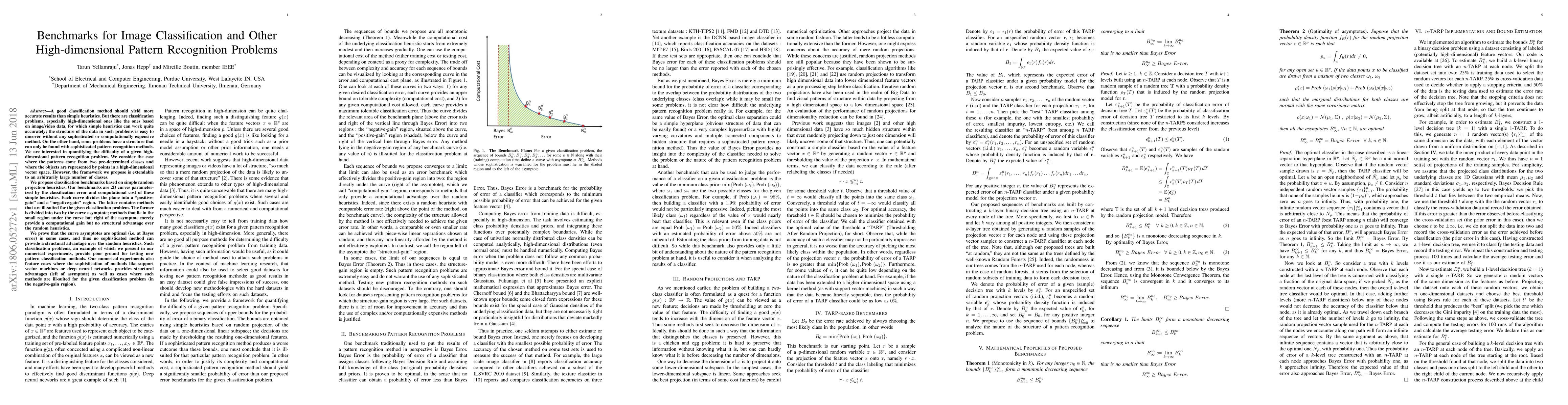 A good classification method should yield more accurate results than simple heuristics. But there are classification problems, especially high-dimensional ones like the ones based on image/video data, for which simple heuristics can work quite accurately; the structure of the data in such problems is easy to uncover without any sophisticated or computationally expensive method. On the other hand, some problems have a structure that can only be found with sophisticated pattern recognition methods. We are interested in quantifying the difficulty of a given high-dimensional pattern recognition problem. We consider the case where the patterns come from two pre-determined classes and where the objects are represented by points in a high-dimensional vector space. However, the framework we propose is extendable to an arbitrarily large number of classes. We propose classification benchmarks based on simple random projection heuristics. Our benchmarks are 2D curves parameterized by the classification error and computational cost of these simple heuristics. Each curve divides the plane into a "positive- gain" and a "negative-gain" region. The latter contains methods that are ill-suited for the given classification problem. The former is divided into two by the curve asymptote; methods that lie in the small region under the curve but right of the asymptote merely provide a computational gain but no structural advantage over the random heuristics. We prove that the curve asymptotes are optimal (i.e. at Bayes error) in some cases, and thus no sophisticated method can provide a structural advantage over the random heuristics. Such classification problems, an example of which we present in our numerical experiments, provide poor ground for testing new pattern classification methods.