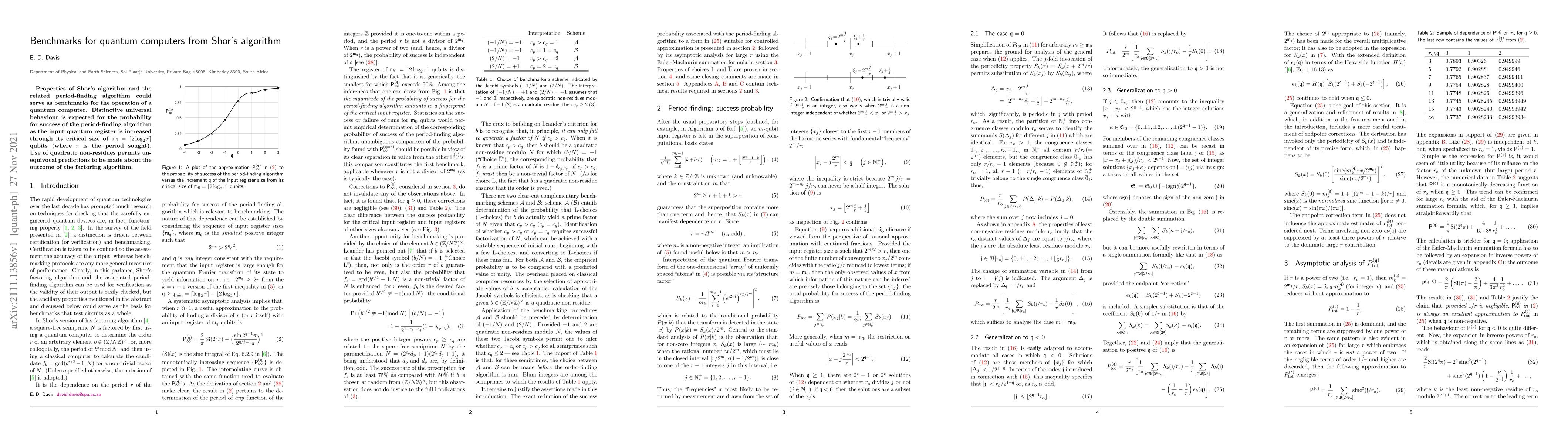 Properties of Shor's algorithm and the related period-finding algorithm could serve as benchmarks for the operation of a quantum computer. Distinctive universal behaviour is expected for the probability for success of the period-finding algorithm as the input quantum register is increased through its critical size of $\mathfrak{m}_0=\lceil 2\log_2 r\rceil$ qubits (where $r$ is the period sought). Use of quadratic non-residues permits unequivocal predictions to be made about the outcome of the factoring algorithm.