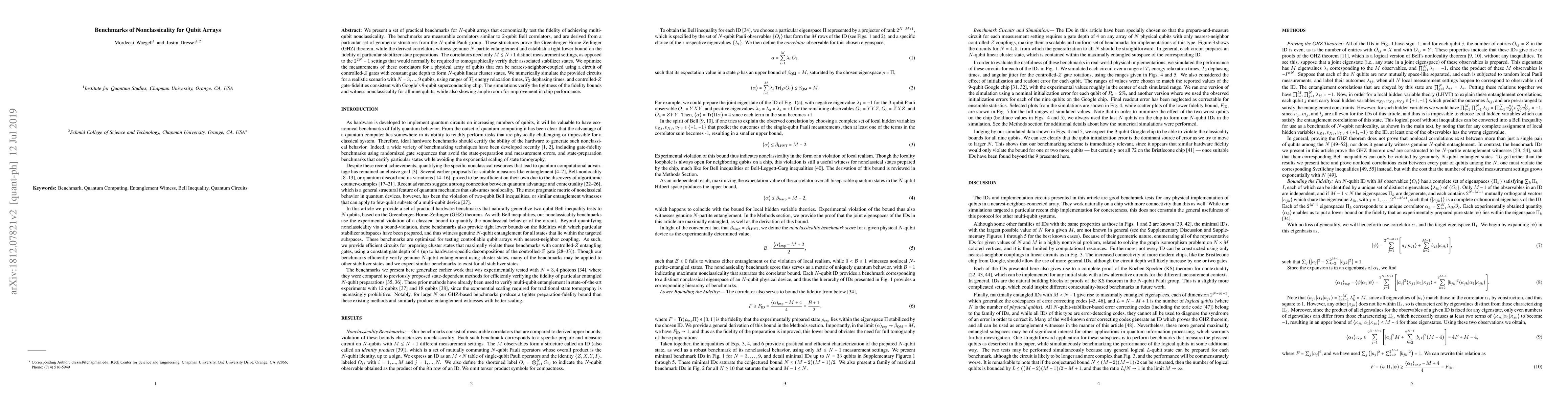We present a set of practical benchmarks for $N$-qubit arrays that economically test the fidelity of achieving multi-qubit nonclassicality. The benchmarks are measurable correlators similar to 2-qubit Bell correlators, and are derived from a particular set of geometric structures from the $N$-qubit Pauli group. These structures prove the Greenberger-Horne-Zeilinger (GHZ) theorem, while the derived correlators witness genuine $N$-partite entanglement and establish a tight lower bound on the fidelity of particular stabilizer state preparations. The correlators need only $M \leq N+1$ distinct measurement settings, as opposed to the $2^{2N}-1$ settings that would normally be required to tomographically verify their associated stabilizer states. We optimize the measurements of these correlators for a physical array of qubits that can be nearest-neighbor-coupled using a circuit of controlled-$Z$ gates with constant gate depth to form $N$-qubit linear cluster states. We numerically simulate the provided circuits for a realistic scenario with $N=3,...,9$ qubits, using ranges of $T_1$ energy relaxation times, $T_2$ dephasing times, and controlled-$Z$ gate-fidelities consistent with Google's 9-qubit superconducting chip. The simulations verify the tightness of the fidelity bounds and witness nonclassicality for all nine qubits, while also showing ample room for improvement in chip performance.