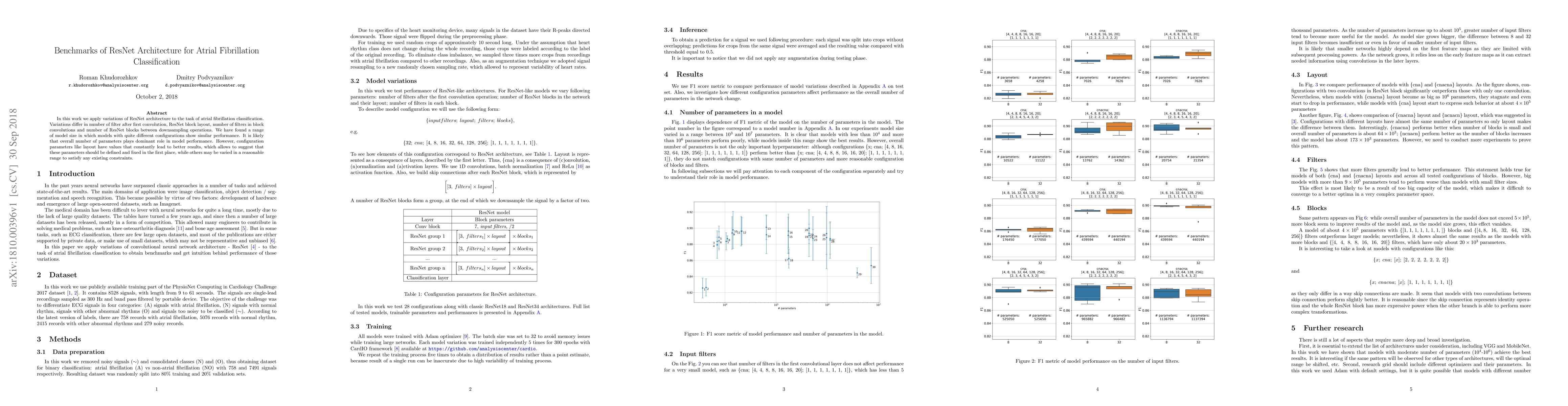This research applies variations of ResNet architecture to atrial fibrillation classification, examining different configurations such as number of filters, ResNet block layout, filters in block convolutions, and number of ResNet blocks between downsampling operations.