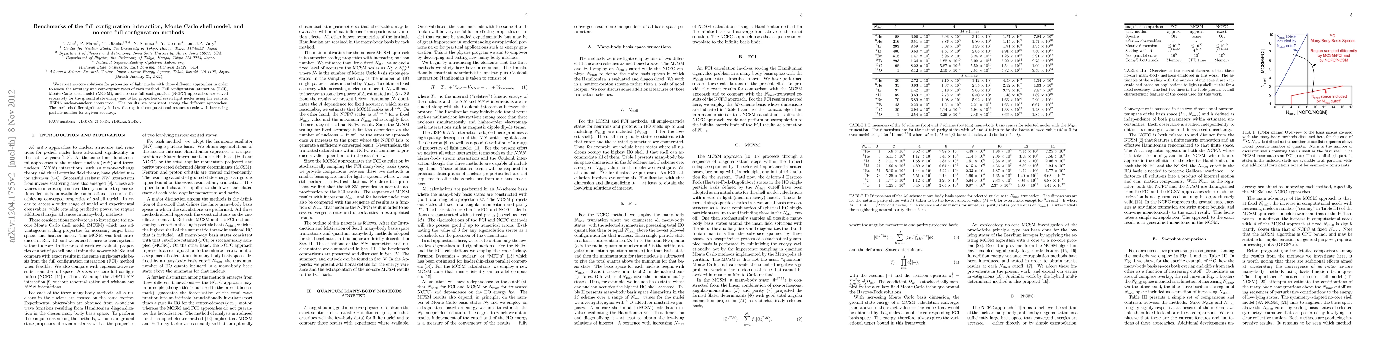 This paper benchmarks three nuclear calculation methods—full configuration interaction (FCI), Monte Carlo shell model (MCSM), and no-core full configuration (NCFC)—to evaluate their accuracy and convergence for light nuclei. The results show consistent outcomes across methods but highlight significant differences in computational resource scaling with particle number.