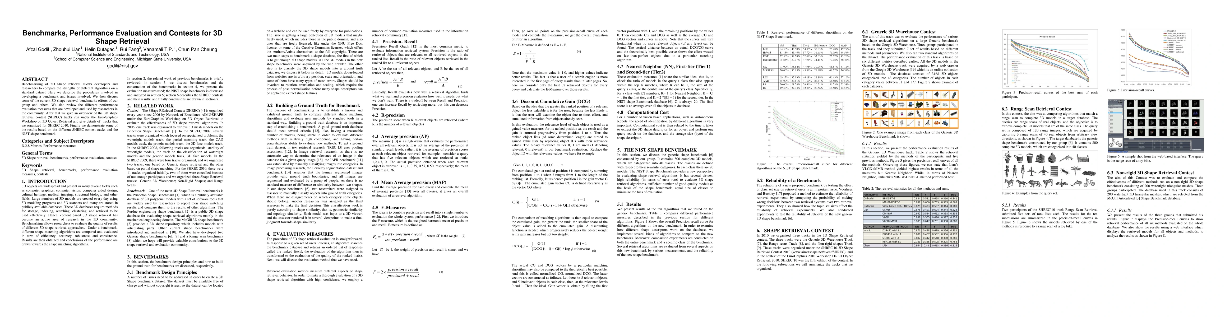 This paper outlines the processes and challenges in developing benchmarks for 3D shape retrieval, reviews current efforts, and discusses performance evaluation measures. It also details the 3D shape retrieval contest (SHREC) and presents results from SHREC 2010 and the NIST shape benchmark.
