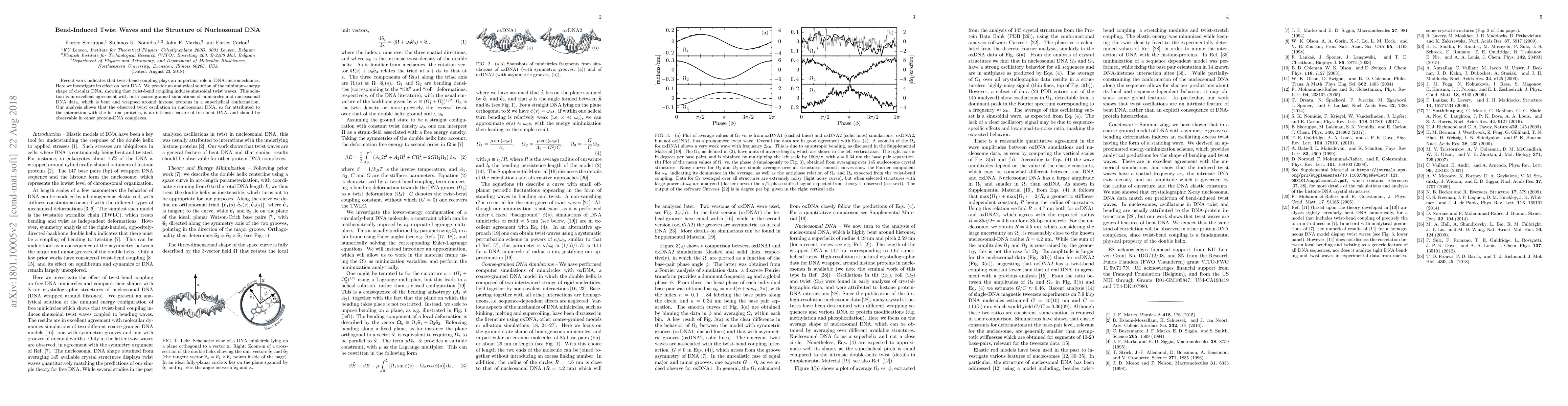 Recent work indicates that twist-bend coupling plays an important role in DNA micromechanics. Here we investigate its effect on bent DNA. We provide an analytical solution of the minimum-energy shape of circular DNA, showing that twist-bend coupling induces sinusoidal twist waves. This solution is in excellent agreement with both coarse-grained simulations of minicircles and nucleosomal DNA data, which is bent and wrapped around histone proteins in a superhelical conformation. Our analysis shows that the observed twist oscillation in nucleosomal DNA, so far attributed to the interaction with the histone proteins, is an intrinsic feature of free bent DNA, and should be observable in other protein-DNA complexes.