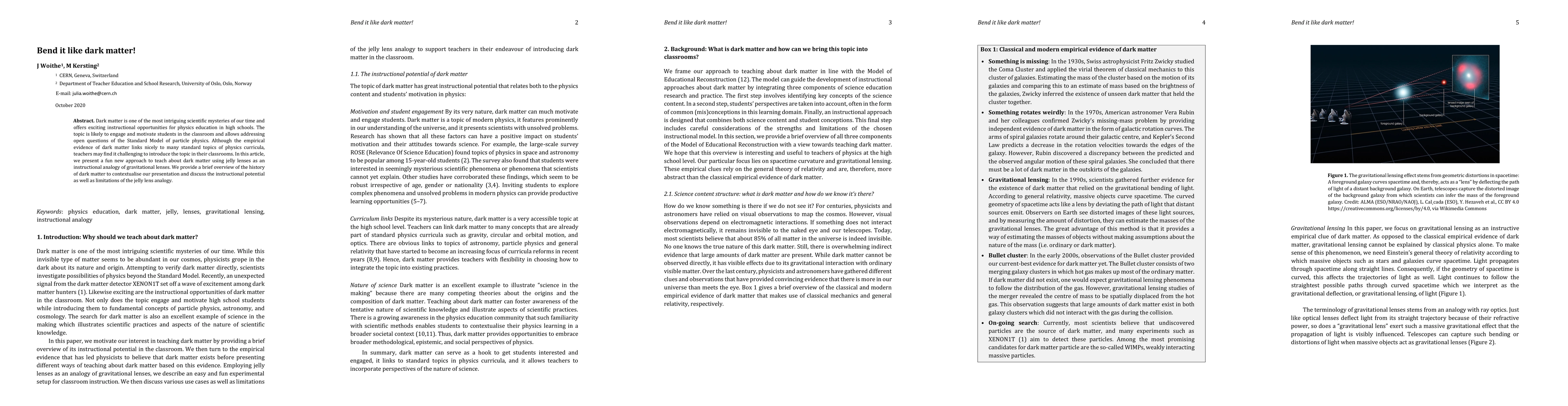 Dark matter is one of the most intriguing scientific mysteries of our time and offers exciting instructional opportunities for physics education in high schools. The topic is likely to engage and motivate students in the classroom and allows addressing open questions of the Standard Model of particle physics. Although the empirical evidence of dark matter links nicely to many standard topics of physics curricula, teachers may find it challenging to introduce the topic in their classrooms. In this article, we present a fun new approach to teach about dark matter using jelly lenses as an instructional analogy of gravitational lenses. We provide a brief overview of the history of dark matter to contextualise our presentation and discuss the instructional potential as well as limitations of the jelly lens analogy.
