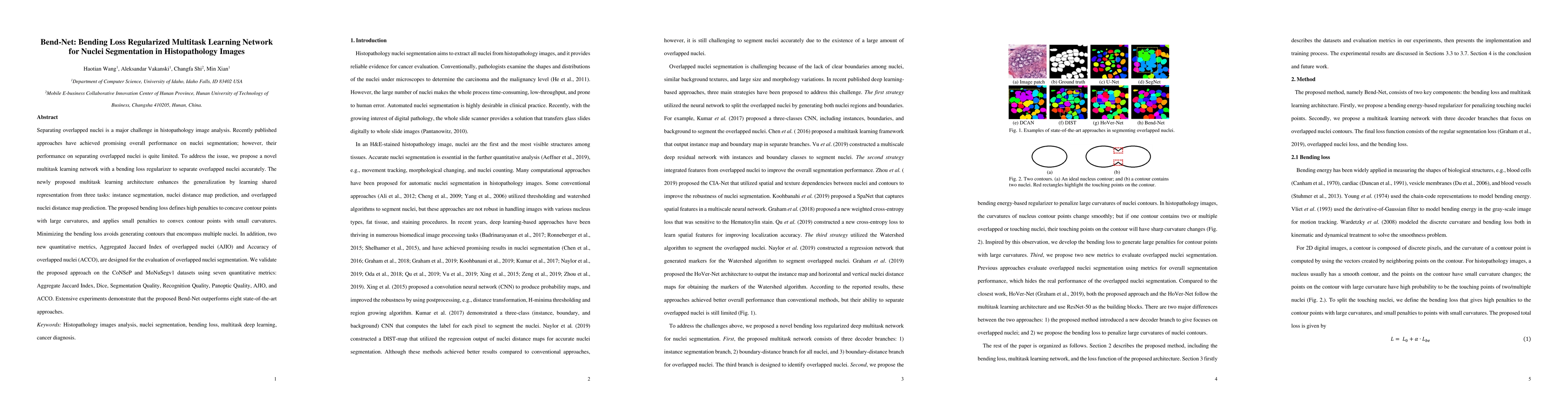 Separating overlapped nuclei is a major challenge in histopathology image analysis. Recently published approaches have achieved promising overall performance on nuclei segmentation; however, their performance on separating overlapped nuclei is quite limited. To address the issue, we propose a novel multitask learning network with a bending loss regularizer to separate overlapped nuclei accurately. The newly proposed multitask learning architecture enhances the generalization by learning shared representation from three tasks: instance segmentation, nuclei distance map prediction, and overlapped nuclei distance map prediction. The proposed bending loss defines high penalties to concave contour points with large curvatures, and applies small penalties to convex contour points with small curvatures. Minimizing the bending loss avoids generating contours that encompass multiple nuclei. In addition, two new quantitative metrics, Aggregated Jaccard Index of overlapped nuclei (AJIO) and Accuracy of overlapped nuclei (ACCO), are designed for the evaluation of overlapped nuclei segmentation. We validate the proposed approach on the CoNSeP and MoNuSegv1 datasets using seven quantitative metrics: Aggregate Jaccard Index, Dice, Segmentation Quality, Recognition Quality, Panoptic Quality, AJIO, and ACCO. Extensive experiments demonstrate that the proposed Bend-Net outperforms eight state-of-the-art approaches.