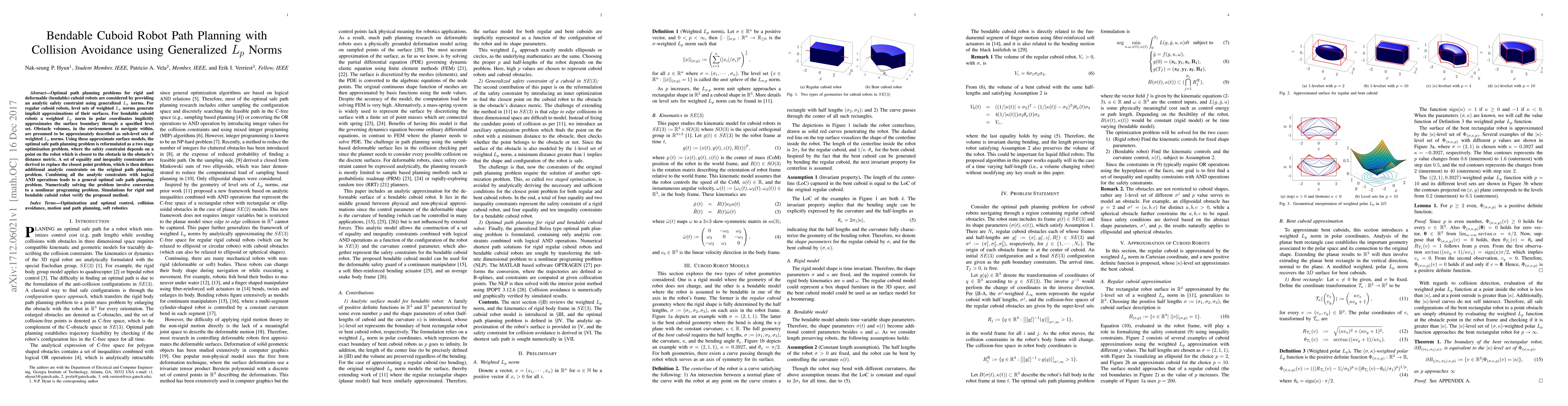 Optimal path planning problems for rigid and deformable (bendable) cuboid robots are considered by providing an analytic safety constraint using generalized $L_p$ norms. For regular cuboid robots, level sets of weighted $L_p$ norms generate implicit approximations of their surfaces. For bendable cuboid robots a weighted $L_p$ norm in polar coordinates implicitly approximates the surface boundary through a specified level set. Obstacle volumes, in the environment to navigate within, are presumed to be approximately described as sub-level sets of weighted $L_p$ norms. Using these approximate surface models, the optimal safe path planning problem is reformulated as a two stage optimization problem, where the safety constraint depends on a point on the robot which is closest to the obstacle in the obstacle's distance metric. A set of equality and inequality constraints are derived to replace the closest point problem, which is then defines additional analytic constraints on the original path planning problem. Combining all the analytic constraints with logical AND operations leads to a general optimal safe path planning problem. Numerically solving the problem involve conversion to a nonlinear programing problem. Simulations for rigid and bendable cuboid robot verify the proposed method.