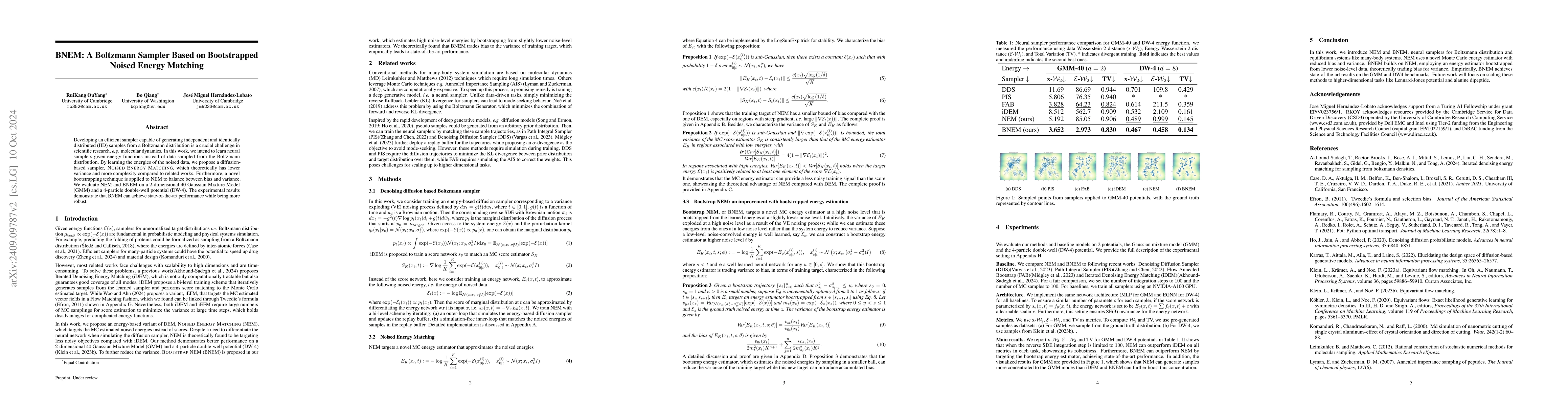 The paper proposes BEnDEM, a Boltzmann sampler based on bootstrapped denoising energy matching, to generate IID samples from Boltzmann distributions efficiently. The method leverages a diffusion-based approach and a novel bootstrapping technique to achieve lower variance and state-of-the-art performance in generating samples for complex energy functions.