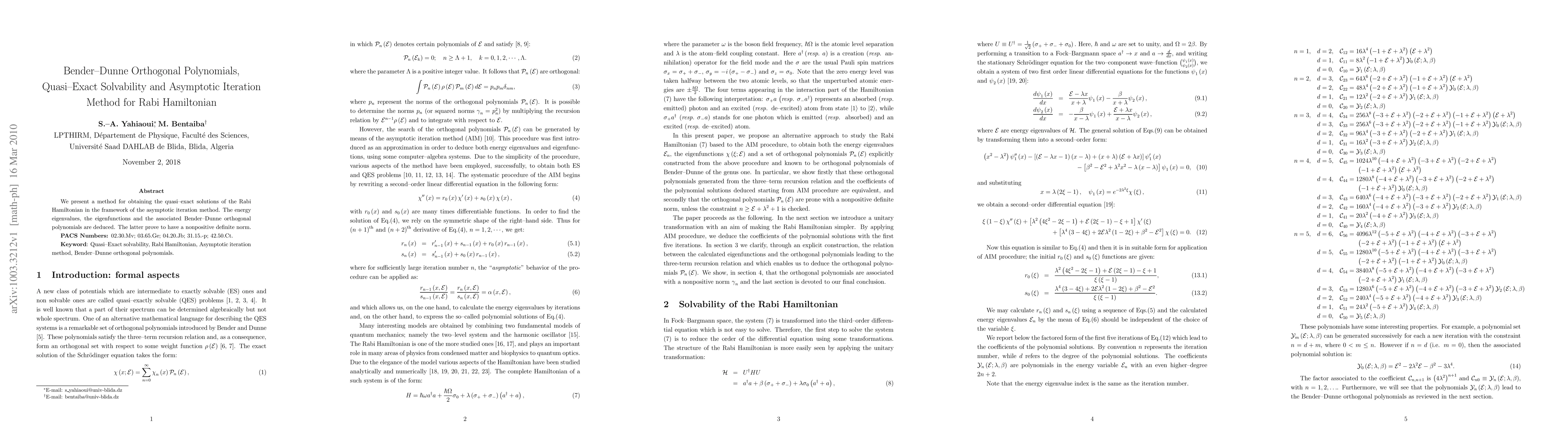 This paper introduces an asymptotic iteration method for finding quasi-exact solutions of the Rabi Hamiltonian, deriving energy eigenvalues, eigenfunctions, and Bender-Dunne orthogonal polynomials, which exhibit nonpositive definite norm.
