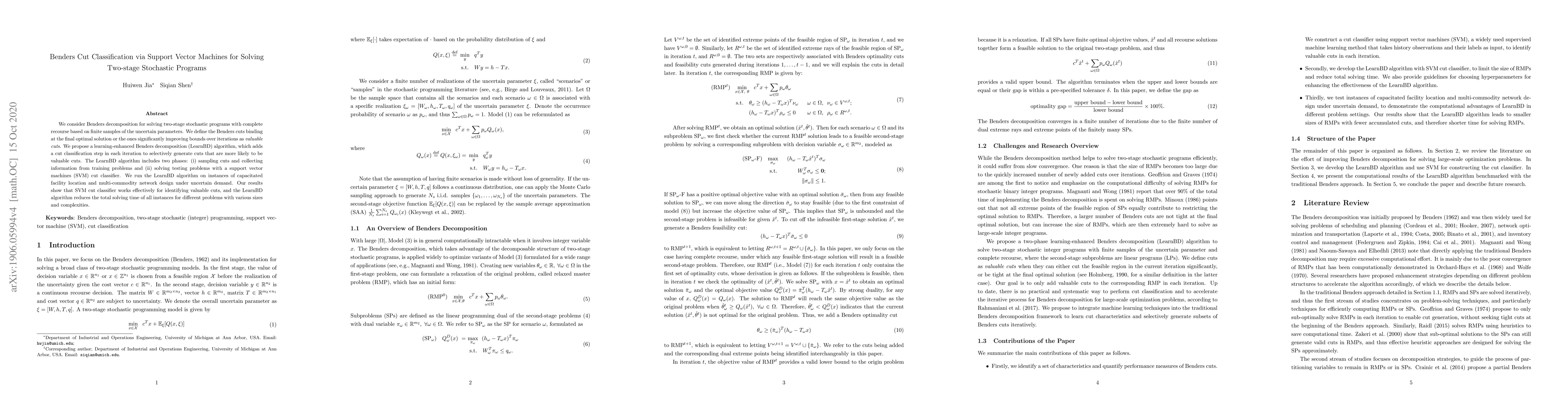 This paper presents a LearnBD algorithm that uses SVM cut classification to enhance Benders decomposition for solving two-stage stochastic programs. The algorithm selectively generates valuable cuts, significantly reducing solving time for capacitated facility location and multi-commodity network design problems.