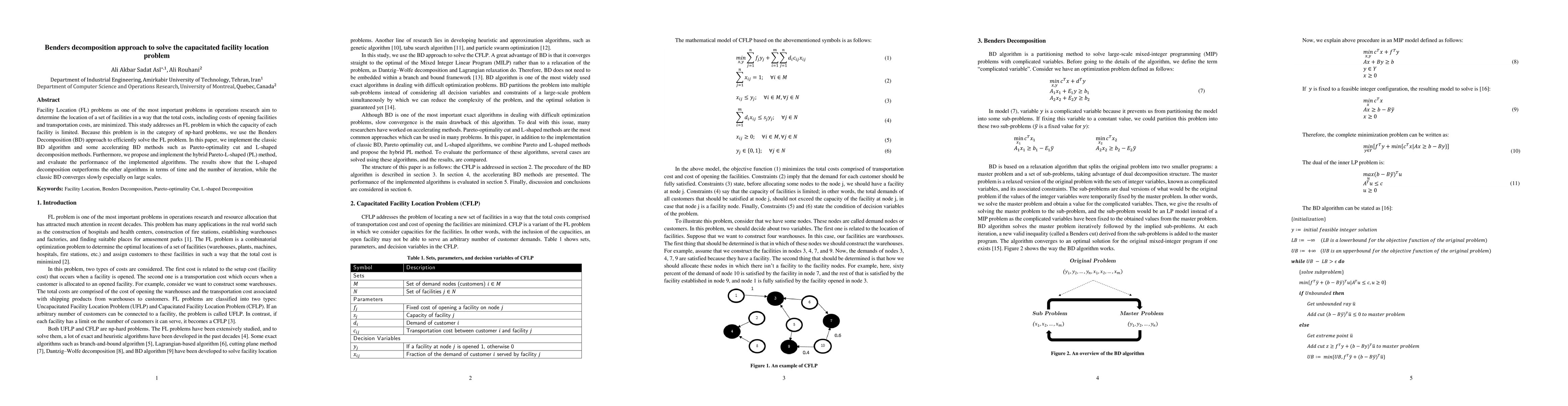 This paper applies Benders Decomposition (BD) and its variants to solve the capacitated facility location problem, which is an NP-hard optimization issue. The study finds that the L-shaped decomposition method outperforms others in terms of computational efficiency and iteration count, while the classic BD approach struggles with large-scale problems.