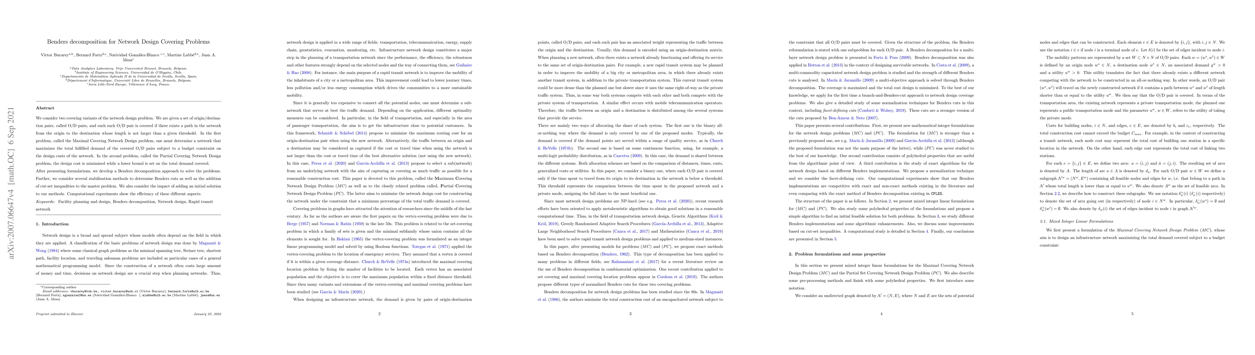 This paper proposes a Benders decomposition approach to solve two network design covering problems with budget constraints and demand lower bounds, showcasing its efficiency in solving complex optimization problems.