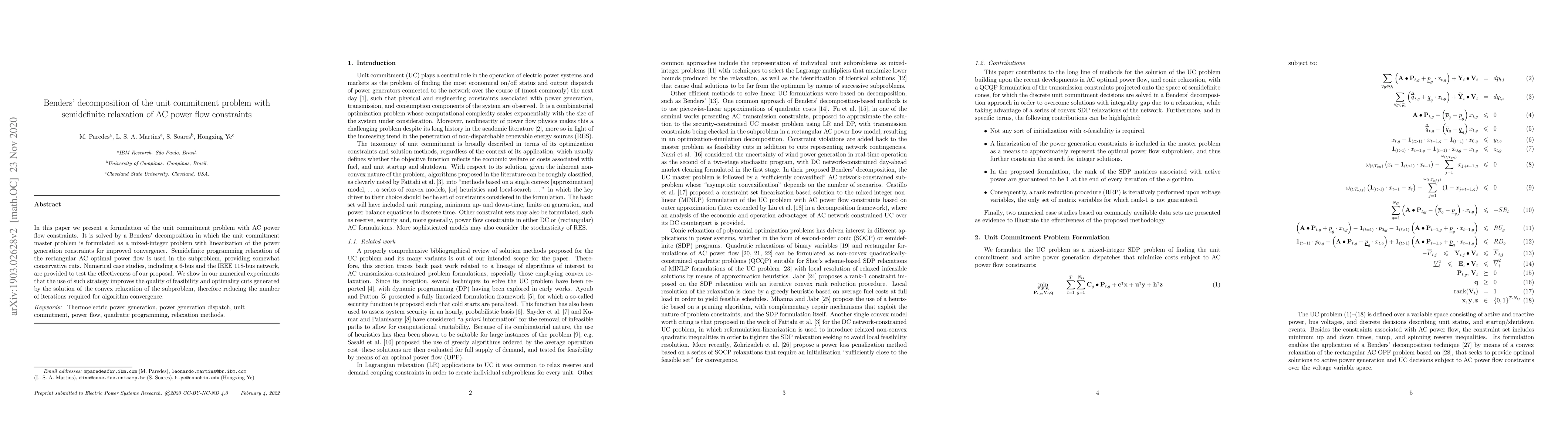 This paper proposes a Benders decomposition method for solving the unit commitment problem with AC power flow constraints, utilizing semidefinite programming relaxation in the subproblem. Numerical results show improved convergence and reduced iteration count compared to traditional methods.