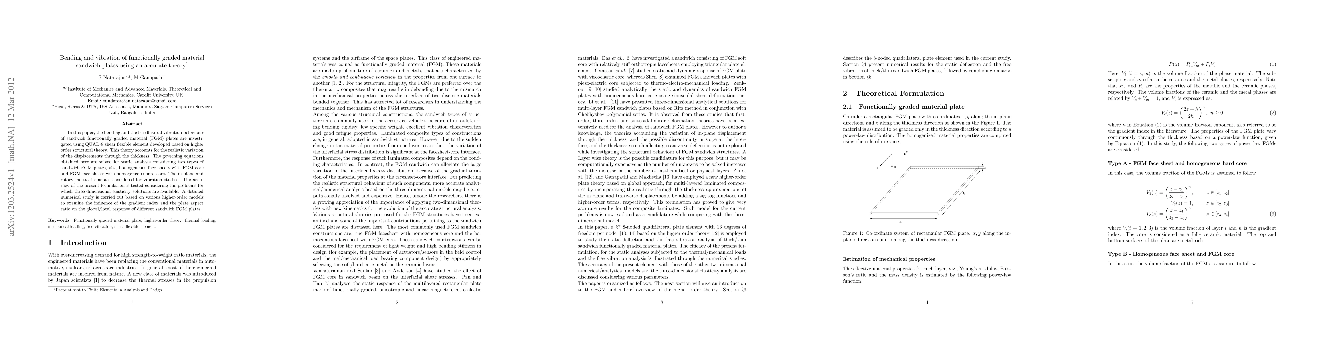 This paper investigates the bending and vibration behavior of sandwich plates made from functionally graded materials (FGM) using a higher-order structural theory with QUAD-8 shear flexible elements. It examines two types of FGM sandwich plates and considers gradient index and aspect ratio effects on their global/local responses.