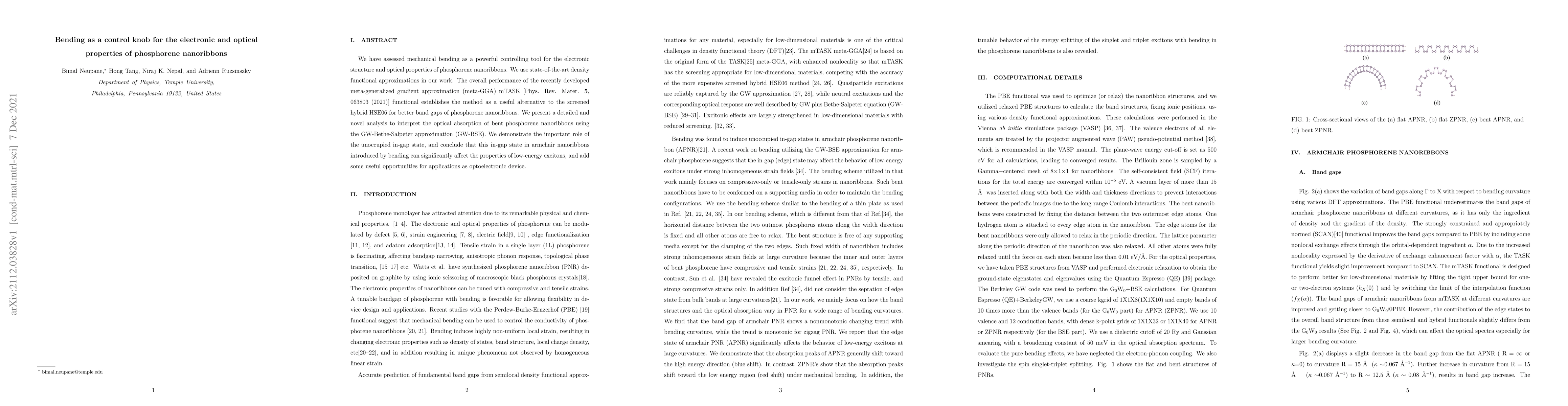 This paper investigates mechanical bending as a method to control the electronic and optical properties of phosphorene nanoribbons, using density functional theory and the meta-GGA mTASK functional. The study reveals that bending introduces an in-gap state, significantly affecting low-energy excitons and offering potential for optoelectronic applications.