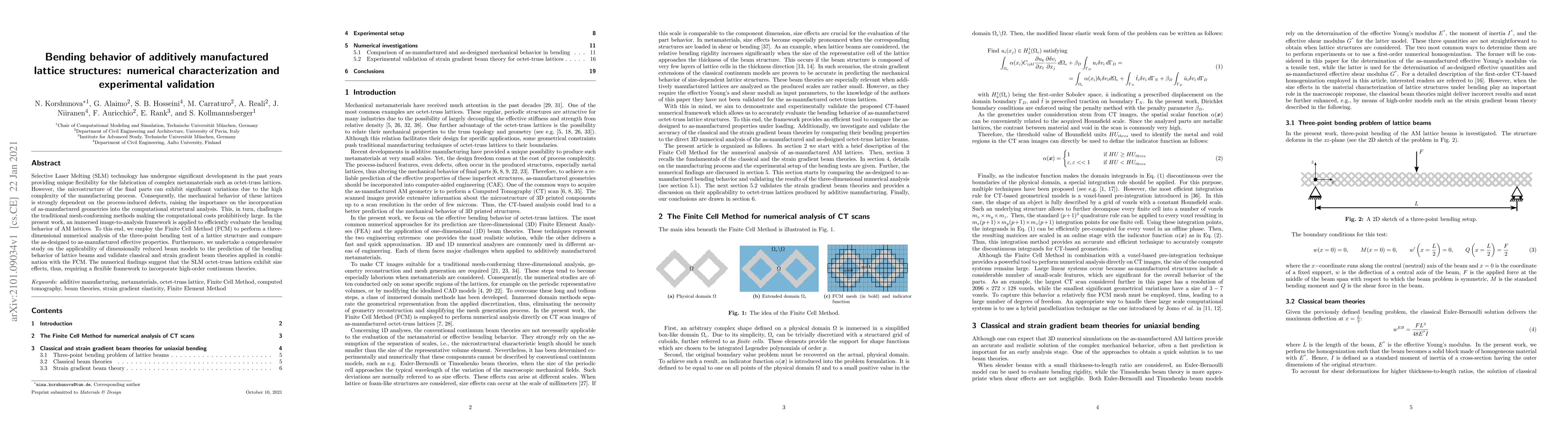 Selective Laser Melting (SLM) technology has undergone significant development in the past years providing unique flexibility for the fabrication of complex metamaterials such as octet-truss lattices. However, the microstructure of the final parts can exhibit significant variations due to the high complexity of the manufacturing process. Consequently, the mechanical behavior of these lattices is strongly dependent on the process-induced defects, raising the importance on the incorporation of as-manufactured geometries into the computational structural analysis. This, in turn, challenges the traditional mesh-conforming methods making the computational costs prohibitively large. In the present work, an immersed image-to-analysis framework is applied to efficiently evaluate the bending behavior of AM lattices. To this end, we employ the Finite Cell Method (FCM) to perform a three-dimensional numerical analysis of the three-point bending test of a lattice structure and compare the as-designed to as-manufactured effective properties. Furthermore, we undertake a comprehensive study on the applicability of dimensionally reduced beam models to the prediction of the bending behavior of lattice beams and validate classical and strain gradient beam theories applied in combination with the FCM. The numerical findings suggest that the SLM octet-truss lattices exhibit size effects, thus, requiring a flexible framework to incorporate high-order continuum theories.