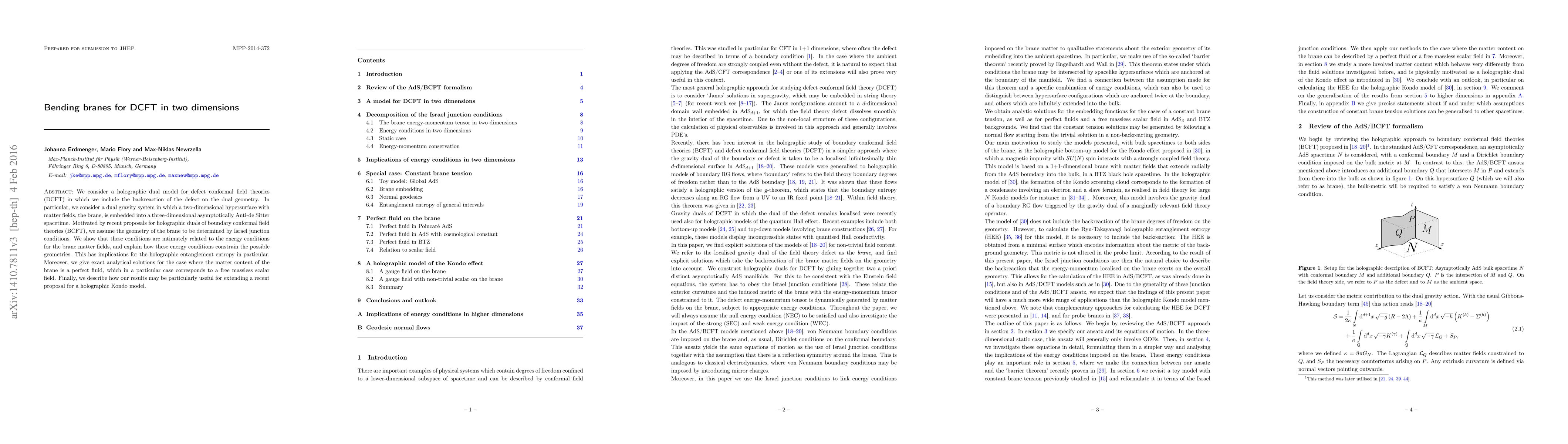 We consider a holographic dual model for defect conformal field theories (DCFT) in which we include the backreaction of the defect on the dual geometry. In particular, we consider a dual gravity system in which a two-dimensional hypersurface with matter fields, the brane, is embedded into a three-dimensional asymptotically Anti-de Sitter spacetime. Motivated by recent proposals for holographic duals of boundary conformal field theories (BCFT), we assume the geometry of the brane to be determined by Israel junction conditions. We show that these conditions are intimately related to the energy conditions for the brane matter fields, and explain how these energy conditions constrain the possible geometries. This has implications for the holographic entanglement entropy in particular. Moreover, we give exact analytical solutions for the case where the matter content of the brane is a perfect fluid, which in a particular case corresponds to a free massless scalar field. Finally, we describe how our results may be particularly useful for extending a recent proposal for a holographic Kondo model.