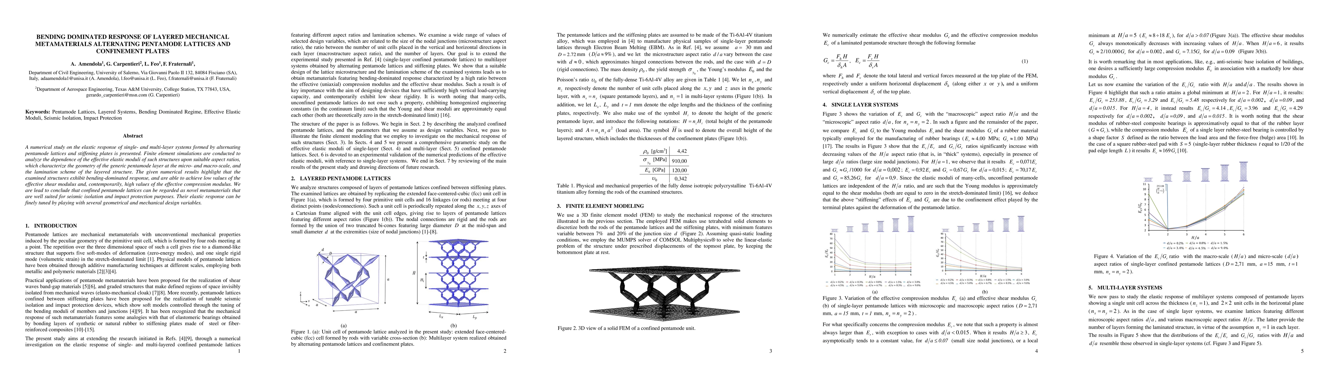 This paper investigates the elastic response of layered mechanical metamaterials composed of alternating pentamode lattices and confinement plates. The study reveals that these structures exhibit bending-dominated behavior and can achieve low shear modulus and high compression modulus, making them suitable for seismic isolation and impact protection.