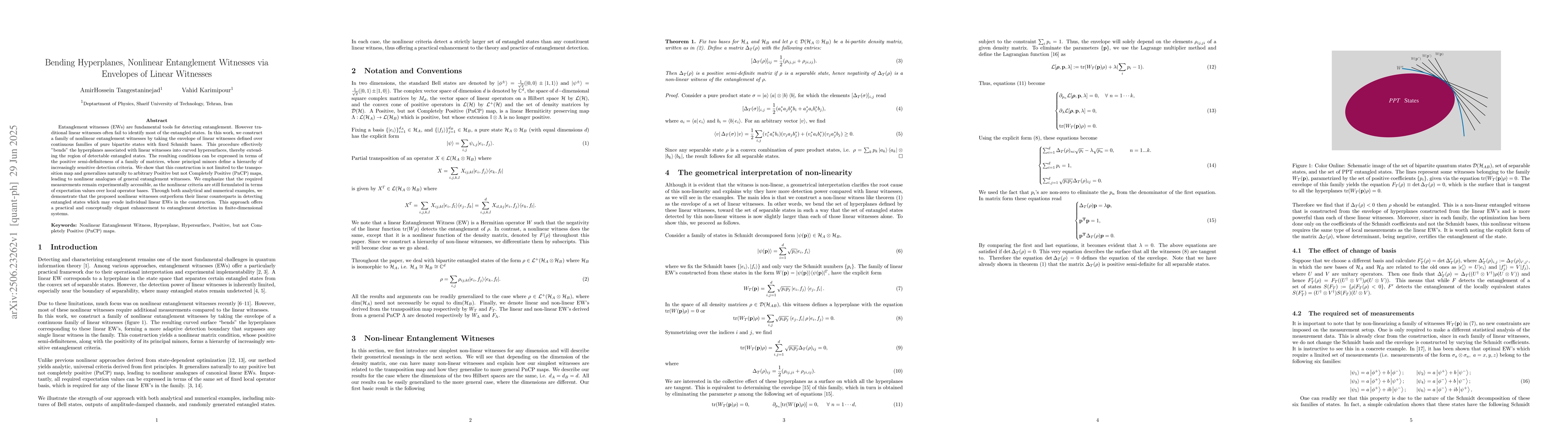 Entanglement witnesses (EWs) are fundamental tools for detecting entanglement. However traditional linear witnesses often fail to identify most of the entangled states. In this work, we construct a family of nonlinear entanglement witnesses by taking the envelope of linear witnesses defined over continuous families of pure bipartite states with fixed Schmidt bases. This procedure effectively "bends" the hyperplanes associated with linear witnesses into curved hypersurfaces, thereby extending the region of detectable entangled states. The resulting conditions can be expressed in terms of the positive semi-definiteness of a family of matrices, whose principal minors define a hierarchy of increasingly sensitive detection criteria. We show that this construction is not limited to the transposition map and generalizes naturally to arbitrary Positive but not Completely Positive (PnCP) maps, leading to nonlinear analogues of general entanglement witnesses. We emphasize that the required measurements remain experimentally accessible, as the nonlinear criteria are still formulated in terms of expectation values over local operator bases. Through both analytical and numerical examples, we demonstrate that the proposed nonlinear witnesses outperform their linear counterparts in detecting entangled states which may evade individual linear EWs in the construction. This approach offers a practical and conceptually elegant enhancement to entanglement detection in finite-dimensional systems.