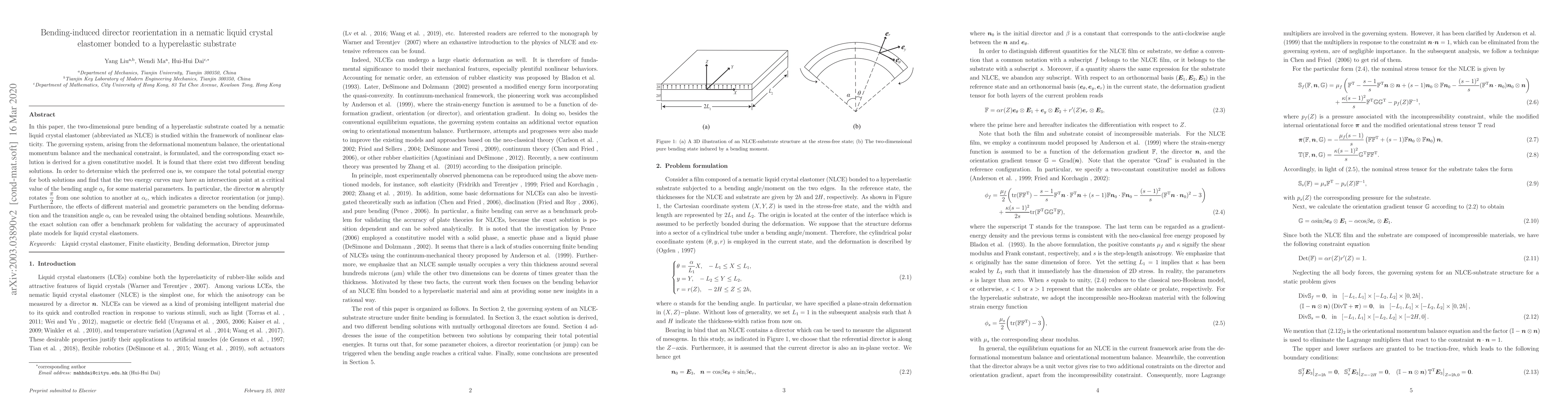 This paper explores the bending-induced director reorientation in nematic liquid crystal elastomers bonded to hyperelastic substrates, deriving exact solutions for two bending scenarios. It identifies a critical bending angle where the director undergoes a $\dfrac{\pi}{2}$ rotation, indicating a director reorientation, and examines the influence of material and geometric parameters on this transition.