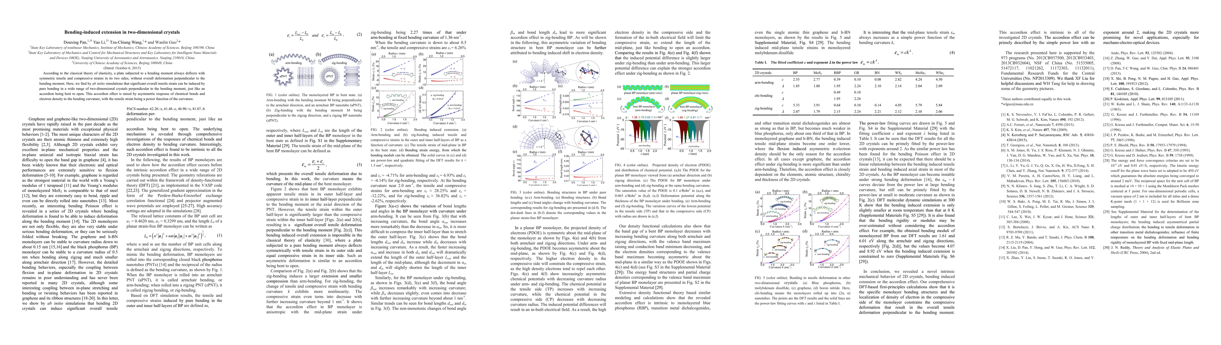 According to the classical theory of elasticity, a plate subjected to a bending moment always deflects with symmetric tensile and compressive strains in its two sides, without overall deformation perpendicular to the bending moment. Here, we find by ab initio simulations that significant overall tensile strain can be induced by pure bending in a wide range of two-dimensional crystals perpendicular to the bending moment, just like an accordion being bent to open. This accordion effect is raised by asymmetric response of chemical bonds and electron density to the bending curvature, with the tensile strain being a power function of the curvature.