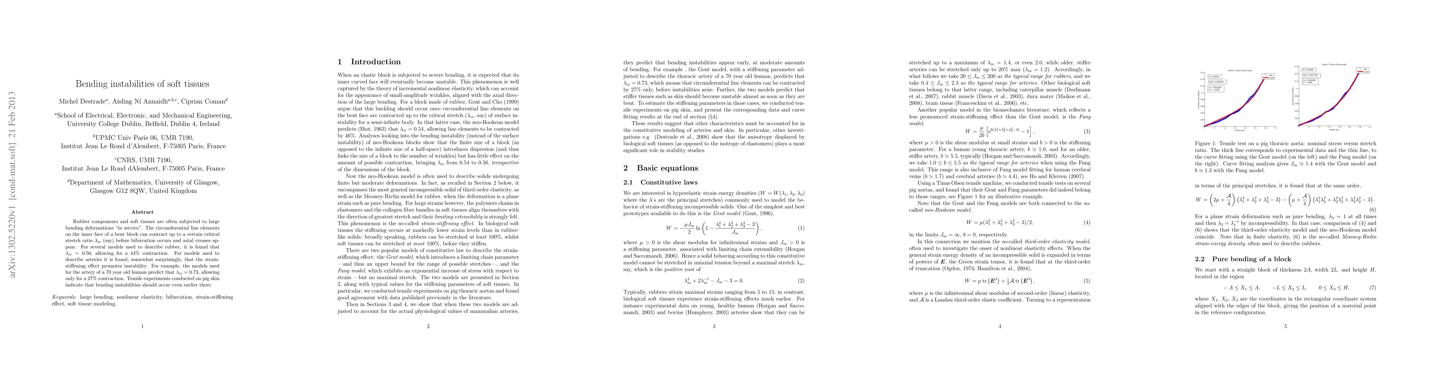 This paper investigates the bending instabilities of rubber and soft tissues, revealing that rubber can contract up to 44% before instability, while strain-stiffening in arteries leads to a more limited 27% contraction before instability. Tensile tests on pig skin suggest even earlier onset of bending instabilities.