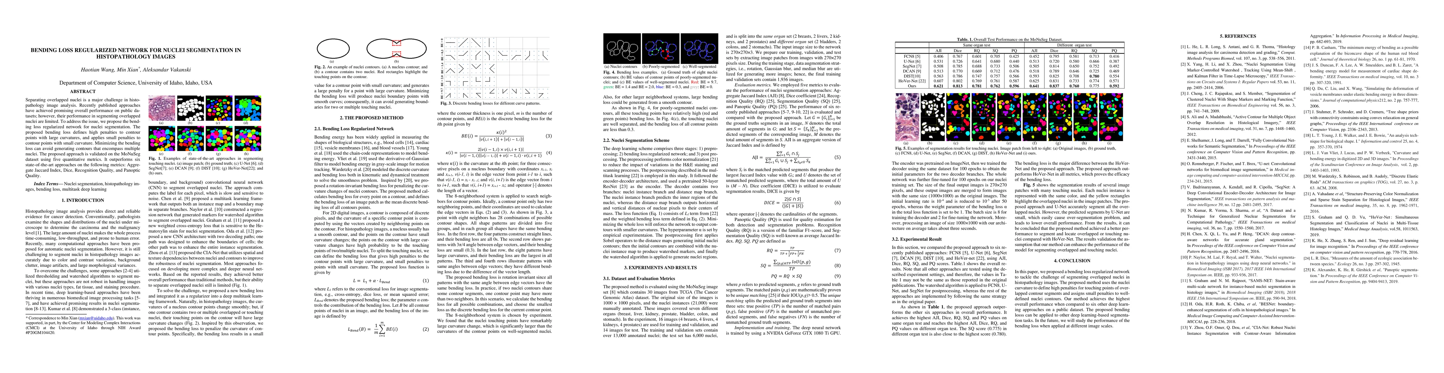 Separating overlapped nuclei is a major challenge in histopathology image analysis. Recently published approaches have achieved promising overall performance on public datasets; however, their performance in segmenting overlapped nuclei are limited. To address the issue, we propose the bending loss regularized network for nuclei segmentation. The proposed bending loss defines high penalties to contour points with large curvatures, and applies small penalties to contour points with small curvature. Minimizing the bending loss can avoid generating contours that encompass multiple nuclei. The proposed approach is validated on the MoNuSeg dataset using five quantitative metrics. It outperforms six state-of-the-art approaches on the following metrics: Aggregate Jaccard Index, Dice, Recognition Quality, and Pan-optic Quality.