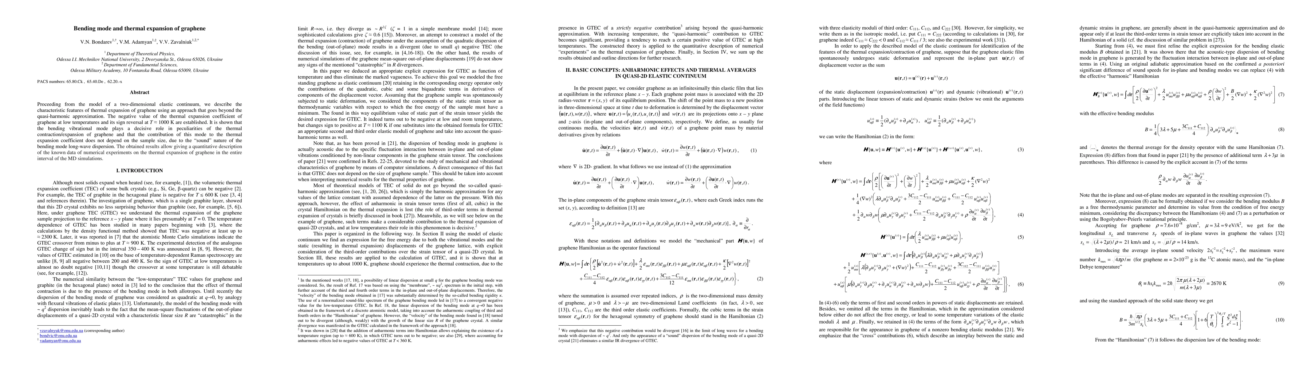 Proceeding from the model of a two-dimensional elastic continuum, we describe the characteristic features of thermal expansion of graphene using an approach that goes beyond the quasi-harmonic approximation. The negative value of the thermal expansion coefficient of graphene at low temperatures and its sign reversal at T about 1000 K are established. It is shown that the bending vibrational mode plays a decisive role in peculiarities of the thermal contraction/expansion of graphene and that the contribution of this mode to the thermal expansion coefficient does not depend on the sample size, due to the "sound" nature of the bending mode long-wave dispersion. The obtained results allow giving a quantitative description of the known data of numerical experiments on the thermal expansion of graphene in the entire interval of the MD simulations.