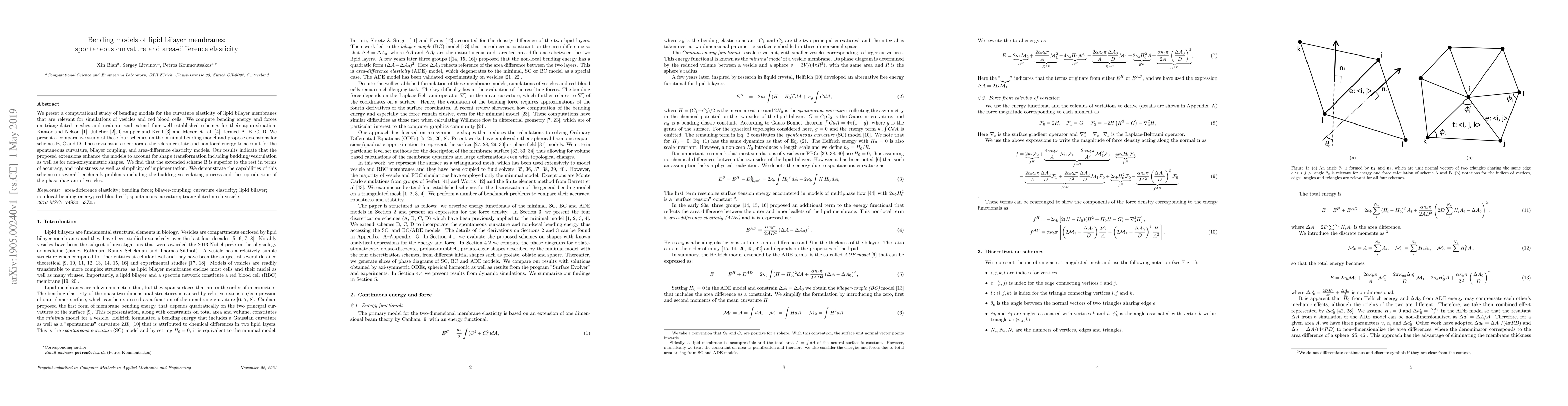 This paper presents a computational study comparing four established models for curvature elasticity in lipid bilayer membranes, proposing extensions to account for spontaneous curvature and area-difference elasticity. The extended scheme B is found to be superior in accuracy, robustness, and simplicity, demonstrating its effectiveness in simulating vesicle budding and reproducing vesicle phase diagrams.