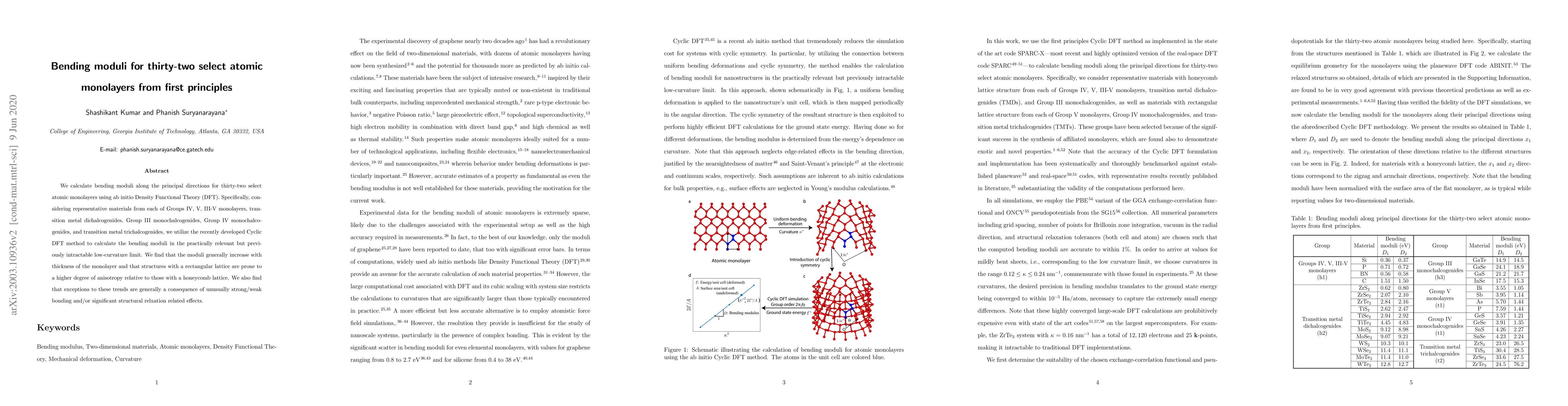 We calculate bending moduli along the principal directions for thirty-two select atomic monolayers using ab initio Density Functional Theory (DFT). Specifically, considering representative materials from each of Groups IV, V, III-V monolayers, transition metal dichalcogenides, Group III monochalcogenides, Group IV monochalcogenides, and transition metal trichalcogenides, we utilize the recently developed Cyclic DFT method to calculate the bending moduli in the practically relevant but previously intractable low-curvature limit. We find that the moduli generally increase with thickness of the monolayer and that structures with a rectangular lattice are prone to a higher degree of anisotropy relative to those with a honeycomb lattice. We also find that exceptions to these trends are generally a consequence of unusually strong/weak bonding and/or significant structural relxation related effects.