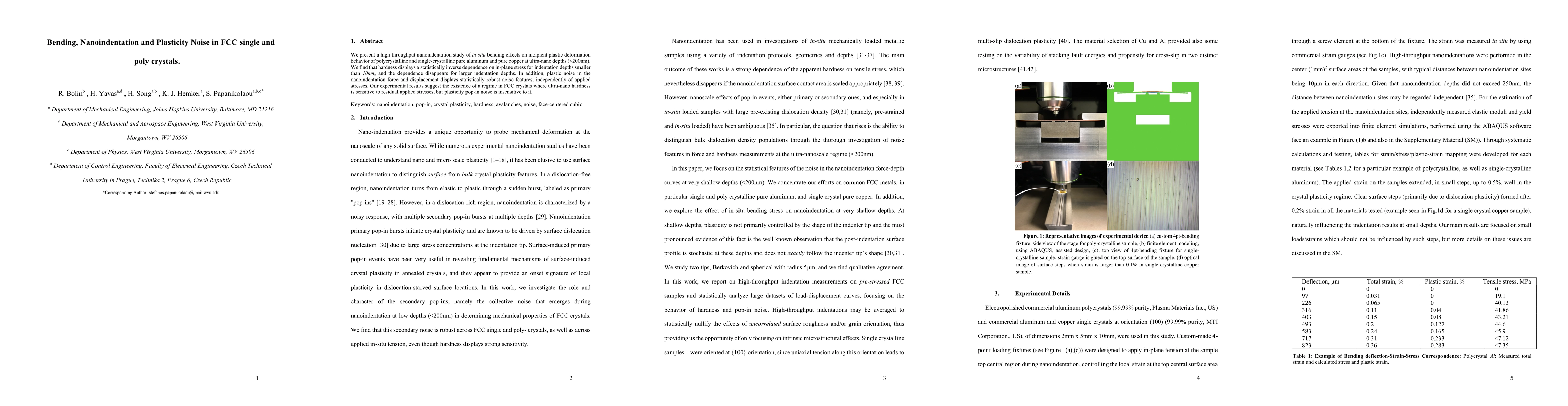 This paper investigates the plastic deformation behavior in pure aluminum and copper crystals under nanoindentation and bending, revealing that hardness inversely correlates with in-plane stress for ultra-nano depths but not for larger depths. It also finds that plastic noise during nanoindentation remains consistent regardless of applied stress, indicating a stress-insensitive plasticity noise regime in FCC crystals.