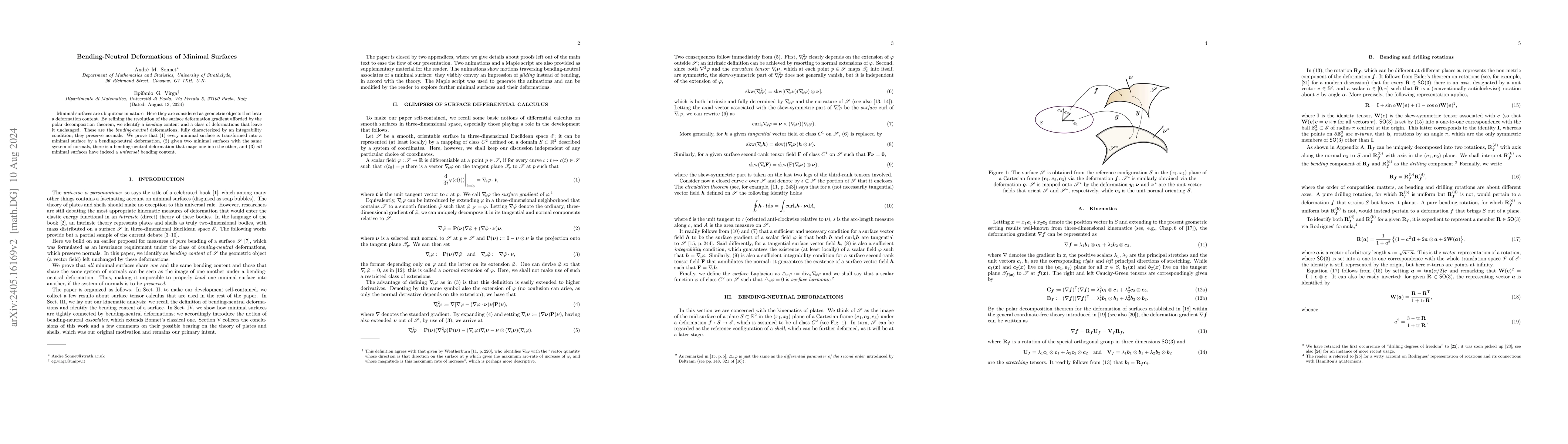 Minimal surfaces are ubiquitous in nature. Here they are considered as geometric objects that bear a deformation content. By refining the resolution of the surface deformation gradient afforded by the polar decomposition theorem, we identify a bending content and a class of deformations that leave it unchanged. These are the bending-neutral deformations, fully characterized by an integrability condition. We prove that (1) every minimal surface is transformed into a minimal surface by a bending-neutral deformation and (2) given two minimal surfaces, there is a bending-neutral deformation that maps one into the other. Thus, all minimal surfaces have indeed a universal bending content.