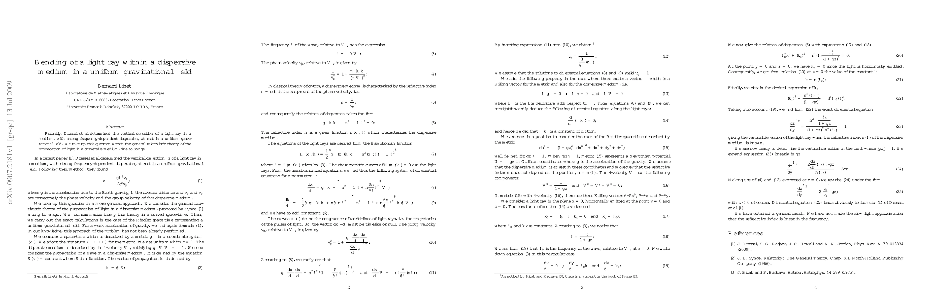 Summary: This paper extends Dressel et al's findings on the vertical deflection of light in a dispersive medium at rest in a uniform gravitational field, employing Synge's general relativistic theory to analyze light propagation within such media.