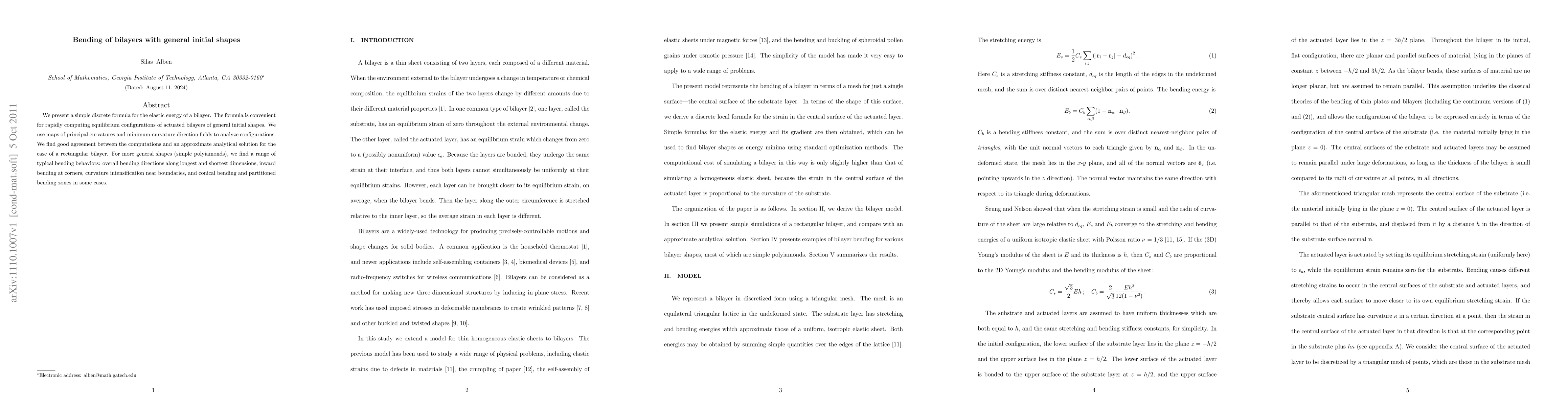 We present a simple discrete formula for the elastic energy of a bilayer. The formula is convenient for rapidly computing equilibrium configurations of actuated bilayers of general initial shapes. We use maps of principal curvatures and minimum-curvature direction fields to analyze configurations. We find good agreement between the computations and an approximate analytical solution for the case of a rectangular bilayer. For more general shapes (simple polyiamonds), we find a range of typical bending behaviors: overall bending directions along longest and shortest dimensions, inward bending at corners, curvature intensification near boundaries, and conical bending and partitioned bending zones in some cases.